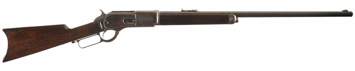 Manufactured in 1882, this is a Second Model 1876 lever action rifle with the dust cover guide rail secured to the receiver by two screws. The rifle has a special order button magazine tube. German silver blade front sight and folding leaf rear sight graduated 2-10 and marked "1876" on top. The top of the barrel is stamped with the two line address/King's patent marking ahead of the rear sight and "CAL. 45-60" at the breech. The serial number is marked on the lower tang and the upper tang is stamped "MODEL 1876." Mounted on a smooth forearm and straight grip stock with iron forend cap and crescent buttplate with compartment (cleaning rod not included). The included hand written Buffalo Bill Historical Center record data sheet confirms the caliber, round barrel, half magazine and plain trigger. The rifle was shipped on May 12, 1892.