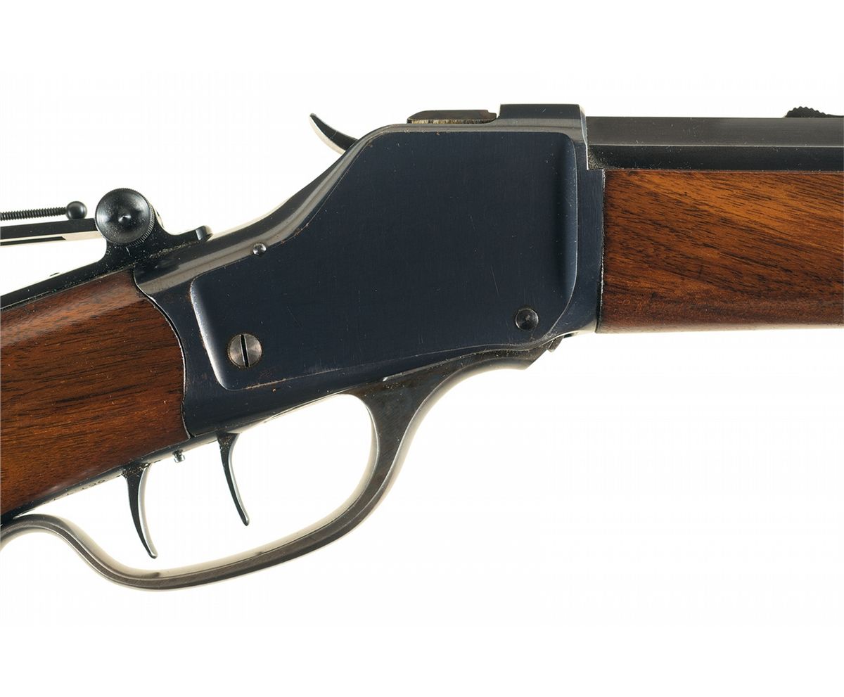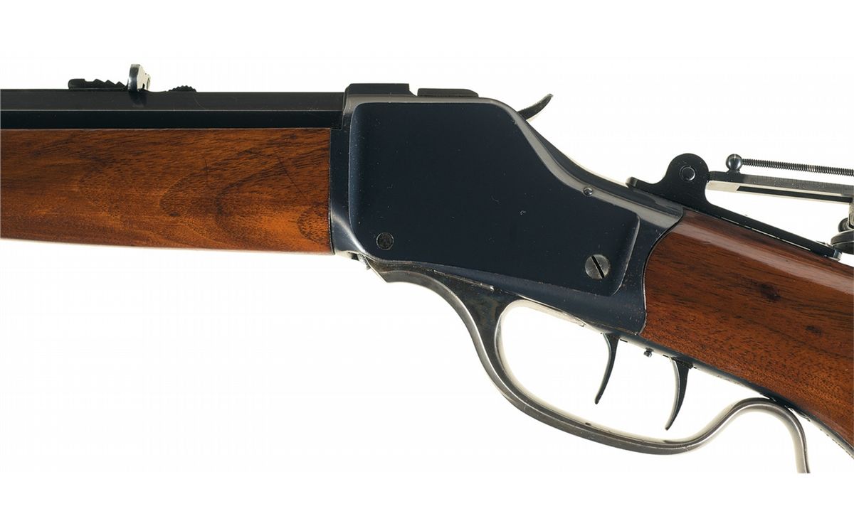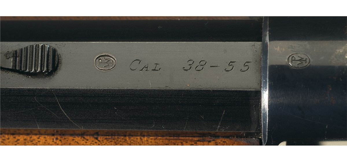 Manufactured circa 1915. This rifle features a #3 octagon barrel with a dovetailed adjustable globe front sight, adjustable rear sporting sight and tang mounted mid-range Vernier peep sight. The top of the barrel is marked with the standard two line Winchester address ahead of the rear sight, "CAL. 38-55" at the breech with the Winchester oval proof ahead of the caliber designation and on top of the receiver at the breech. The serial number is marked on the lower tang and "PAT/OCT. 7. 79" directly behind the trigger. All blue finish with casehardened lever, equipped with special order double set triggers and mounted with a smooth Schnabel forearm with ebony insert and deluxe special order plain pistol grip stock with a hard rubber Winchester grip cap and steel crescent buttplate. Comes complete with a leather tang sight cover