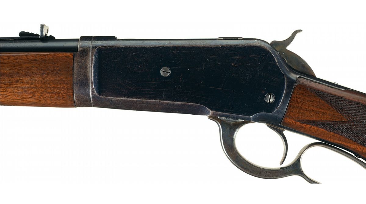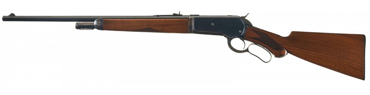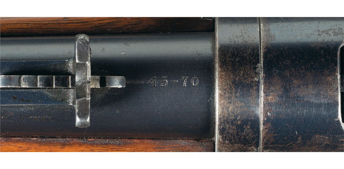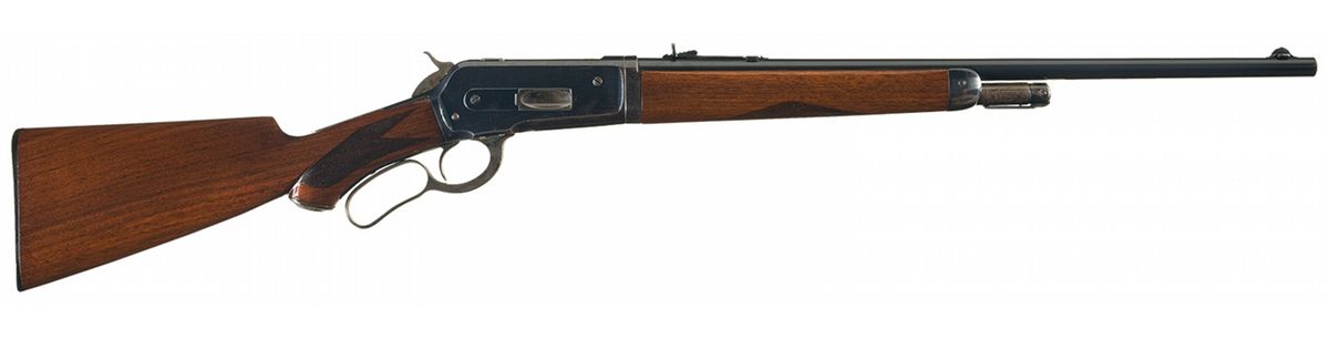 This is an exceptional example of a deluxe, special order Winchester Model 1886 take-down rifle as manufactured in late 1900's. This rifle has several very rare special order features such as: (1) take down barrel/receiver (2) half-length magazine (3) pistol grip stock (4) shotgun style buttstock with shotgun style buttplate (5) checkered stock and forend (6) rubber butt plate. The unusual aspects of this rifle is that with all these special order features the walnut stock and forend are both plain, non-figured walnut and the checkered panels on the stock and forend are both very small. The rifle has a blue finish on the barrel, magazine, forearm cap, receiver, loading gate and trigger. The hammer and lever are color casehardened. The stock has a black, hard rubber, pistol grip cap embossed with "WINCHESTER REPEATING ARMS" in relief and a black, hard rubber, checkered, shotgun buttplate with the circular Winchester logo in the center. The round barrel has a Lyman "sheard bead" front sight with ivory bead and a Winchester, adjustable sporting rear sight. The top of the barrel is roll-stamped in two lines "MANUFACTURED BY THE/-WINCHESTER REPEATING ARMS CO. NEW HAVEN. CONN. U.S.A.-" with the left rear side marked "NICKEL STEEL" only with no other markings, with "45-70" stamped in front of the receiver. Again this is an unusual caliber since it was manufactured at just about the time the 33 WCF was coming out and it has the nickel steel barrel which was really intended for smokeless powder cartridges. The 1884 and 1885 patent dates are roll-stamped on the lower tang behind the trigger and the serial number "122747" is stamped on the lower tang behind the tang screws.