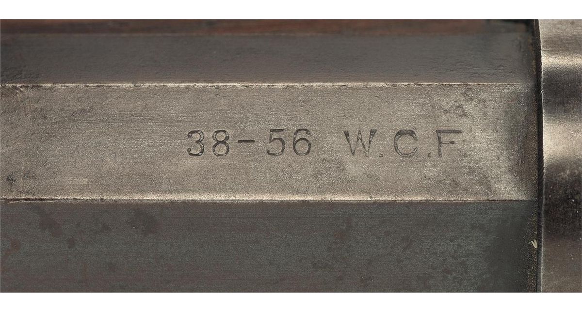 According to the records of the Buffalo Bill Historical Center (copy of abstract included), this rifle was shipped on January 21, 1992 in 38/56 caliber with a 28 inch barrel and a set trigger. Rocky Mountain German silver blade front sight and adjustable sporting notch rear sights on the long barrel, with the 2-line Winchester address on the top flat ahead of the rear sight, "38-56 W.C.F." towards the breech, and "-Model 1886-" on the upper tang. Smooth straight wrist stock, with a metal forearm tip and a smooth buttplate.