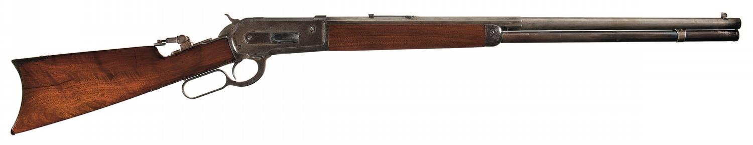 Manufactured in 1892 with a special order 26 inch part octagon barrel. Blade front sight with non-factory two leaf rear sight (1 folding leaf and 1 fixed leaf with elevator absent) and an unidentified tang peep sight made for windage and elevation. The top barrel flat is marked with the two line address ahead of the rear sight and "38-56" at the breech with the two line, two patent dates marking along with the serial number on the lower tang. Smooth forearm and straight grip stock with forend cap and crescent buttplate.