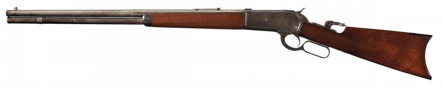 Condition: Good as partially refinished. The barrel and replaced magazine tube assembly both retain traces of original blue finish with the balance a smooth cleaned artificial brown patina. The barrel address and caliber marking are both very lightly legible. The receiver and lever retain traces of silvered out original case colors with the balance a mottled gray patina. The buttplate and forend cap have a smooth dark patina. There is an area of minor pitting on the magazine and some very scattered minor spotting. The buttstock has been repaired and refinished at the wrist, otherwise the wood is good with some minor dings and scratches. A coat of clear varnish has been added to the forearm.