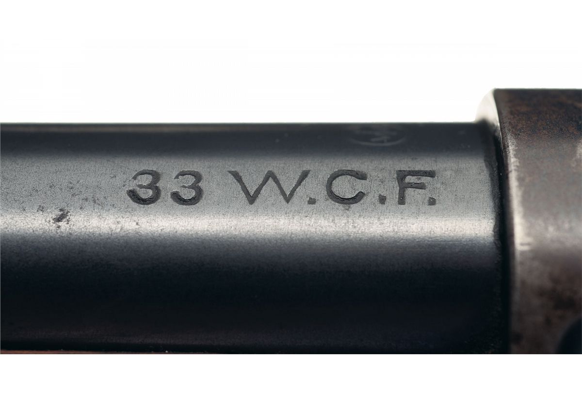 Manufactured in 1916. Beaded Lyman blade front and elevation adjustable rear sights with a special order half magazine. The barrel has the two line address/patent dates marking, two line nickel steel marking and "33 W.C.F." on the left side with the factory proof on the barrel and receiver. The upper tang is stamped with the three line model/trademark information. Smooth straight grip stock with a factory checkered hard rubber shotgun style buttplate.