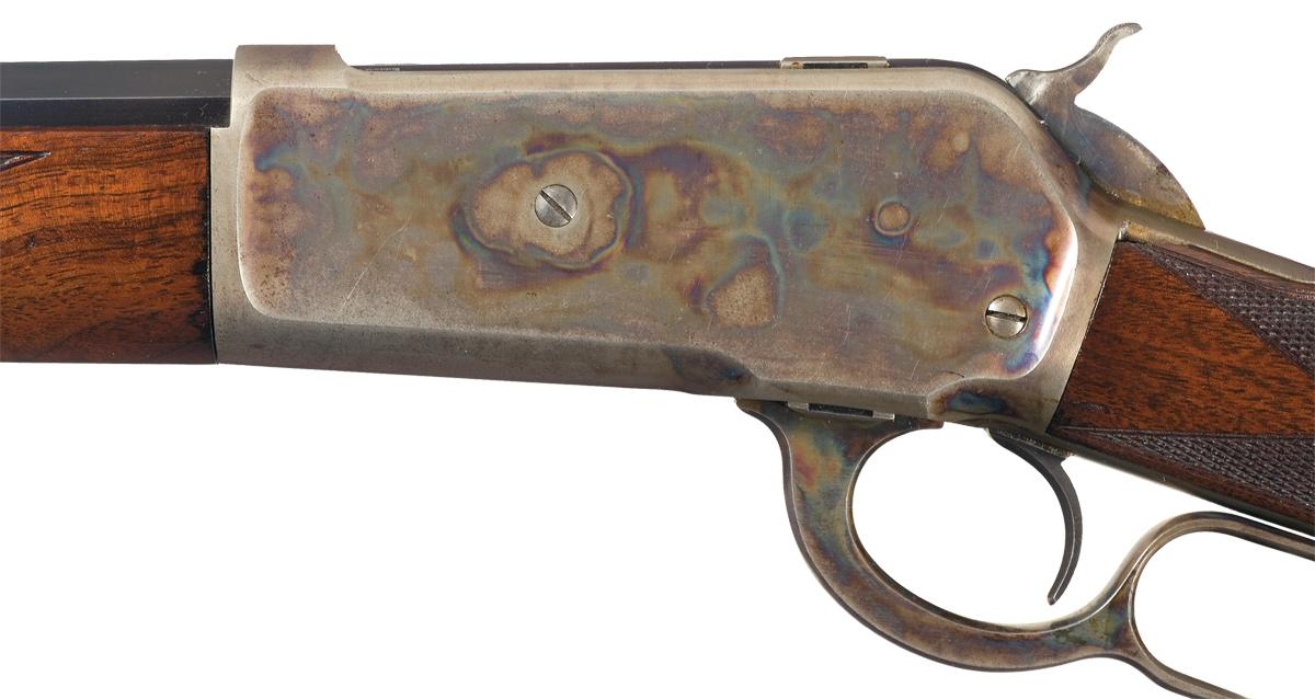 Condition: Excellent. The rifle retains 95% of the original blue. The barrel, bolt and loading gate have nearly all of the original blue finish. The case colors are 90% intact, mostly on the top and bottom of the receiver and the bottom of the loading lever have a slight silver patina. The case colors on the forearm cap hammer and sides of the receiver and loading lever remain vivid. The buttplate has a smooth, silver-gray, patina. The barrel and receiver markings are crisp. The bore is bright. The stock and forearm are in excellent condition; the checkered panels are sharp with minimal handling wear, nearly all of the original varnish finish is intact. The stock and forearm show only very minimal storage wear. This is an excellent example of a Winchester Model 1886 Fancy Sporting Rifle with octagon barrel, half-magazine, casehardened receiver and checkered stock and forearm.
