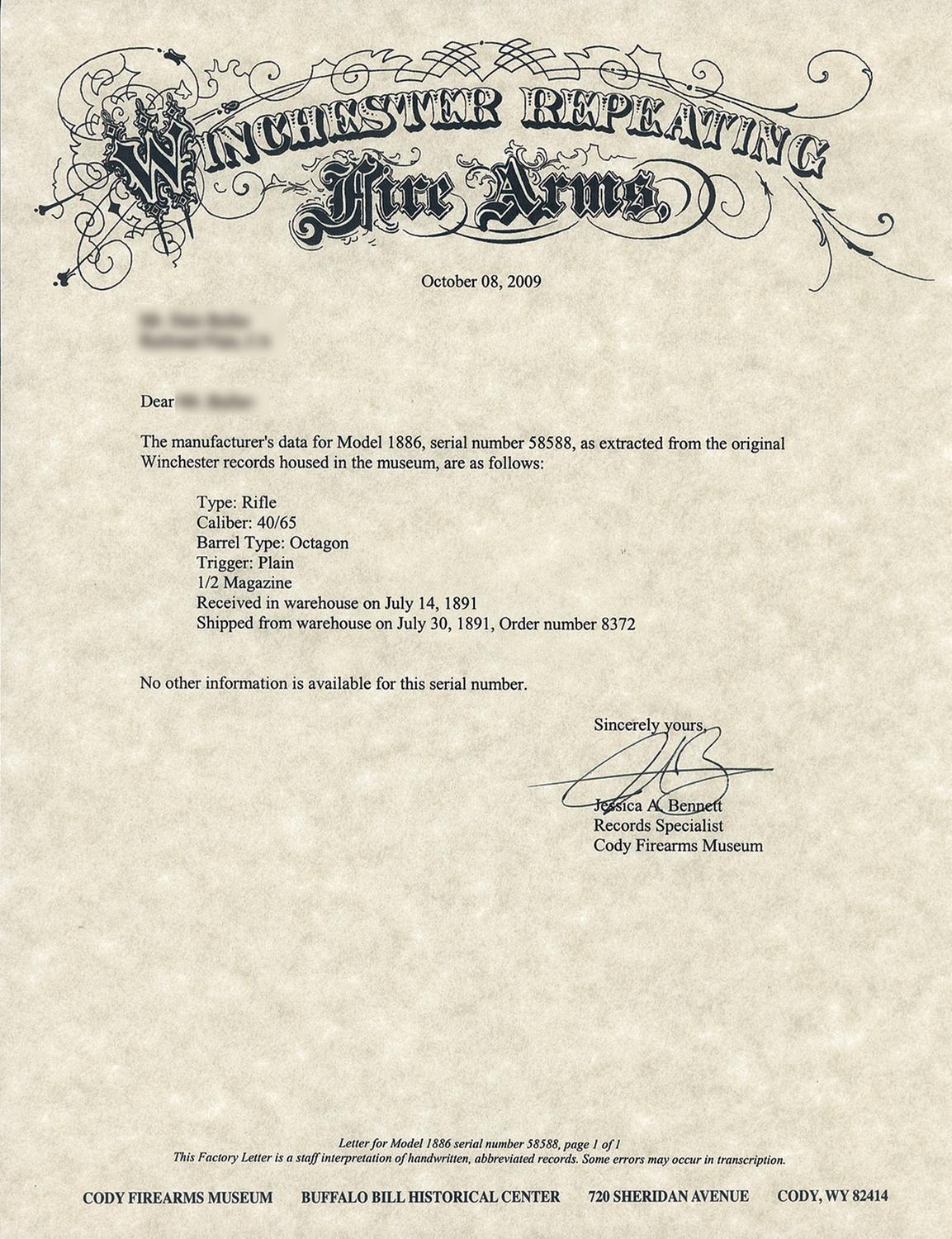 Winchester Model 1886 Fancy Sporting Rifle with Cody Firearms Museum letter. The Cody Firearms Museum letter states that this rifle was shipped from the Winchester warehouse on July 30, 1891. The Cody letter describes the rifle as: Caliber: 40/65, Octagon barrel, Plain Trigger and "1/2 Magazine". The rifle has a blued octagon barrel, bolt loading gate and trigger. The forearm cap, receiver, hammer, loading lever and crescent buttplate are color casehardened. The non-listed straight grain walnut stock and forearm have Winchester "Style H" checkering with a varnish finish. The barrel is fitted with a nickel-silver, fixed blade front sight and sporting style rear sight. The top barrel flat is roll-stamped with the two-line legend: "- MANUFACTURED BY THE - / -WINCHESTER REPEATING ARMS CO.NEW HAVEN.CONN.U.S.A.-" ahead of the rear sight and the caliber designation, "40-65 W.C.F." behind it. "-MODEL 1886-" is roll-stamped on the upper receiver tang. The 1884/1885 patent dates and the serial number, "58588" are located on the lower receiver tang.