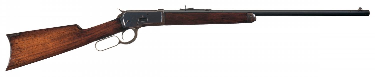 Manufactured in 1908. Blade front sight (missing bead) and buckhorn rear sight with button magazine tube. The top of the barrel is marked with the two line address/patent date, "25-20 W.C.F." on the left at the breech, and the factory proof is on top of the barrel and receiver at the breech. Three line model, maker, and trademark marking on the upper tang and the serial number on the bottom of the receiver. Smooth forearm and straight grip stock with metal forearm tip and smooth crescent steel buttplate.