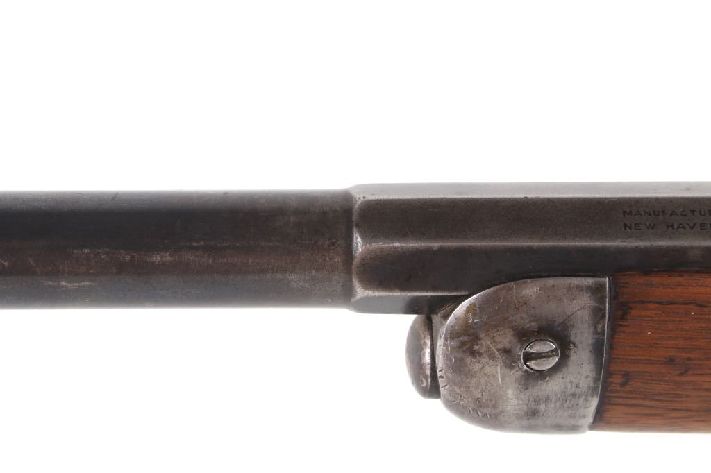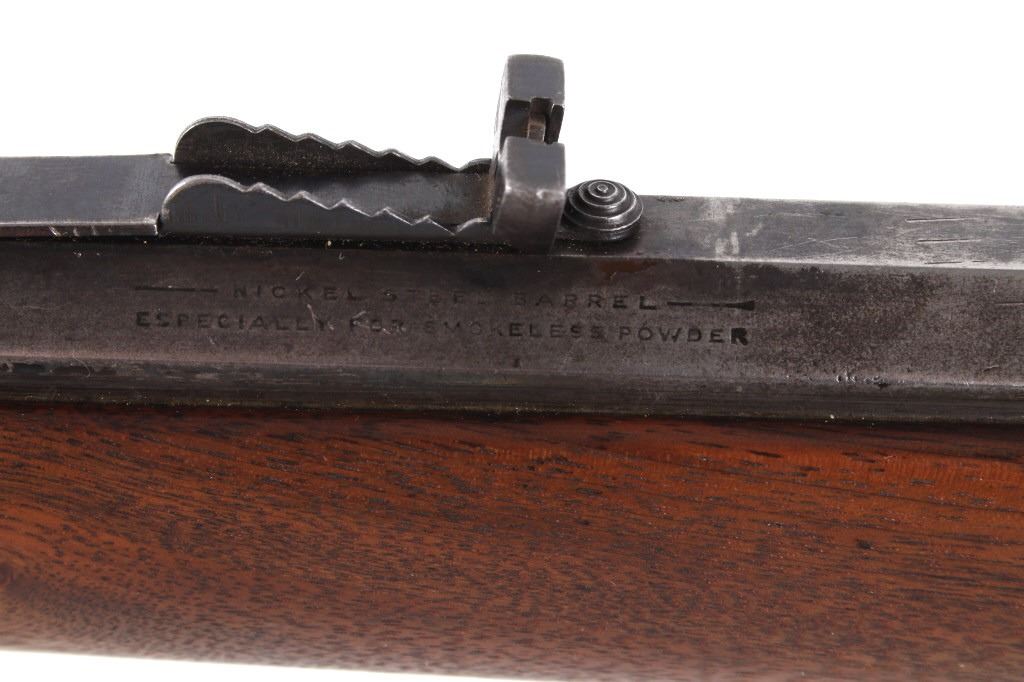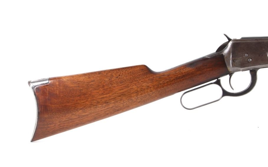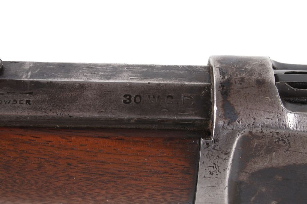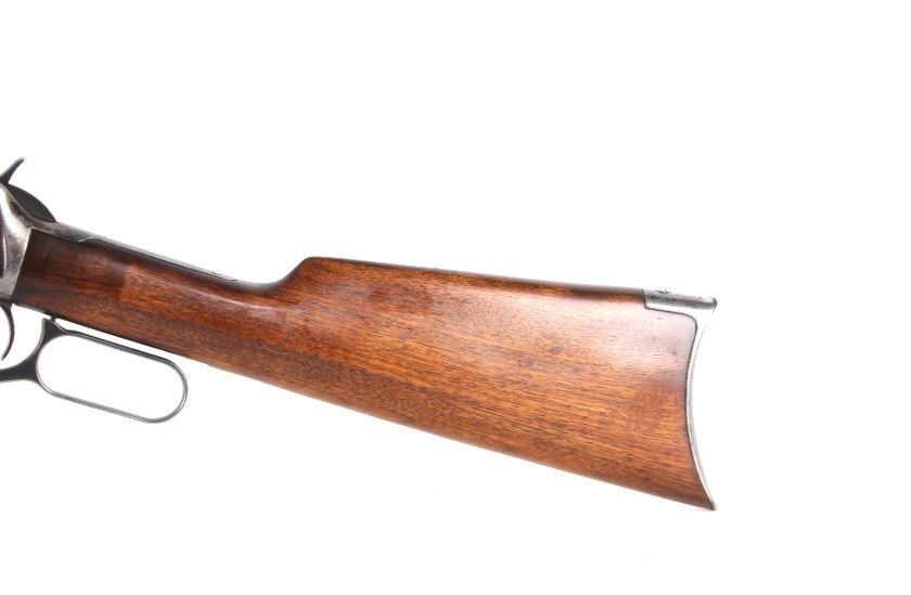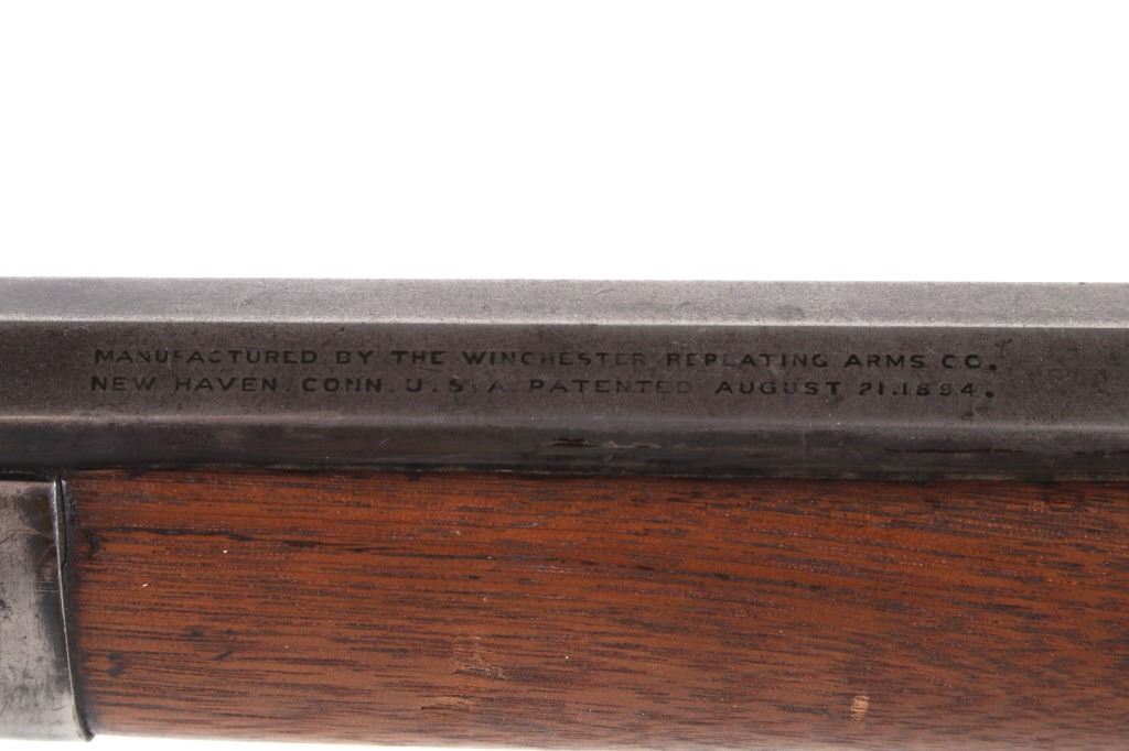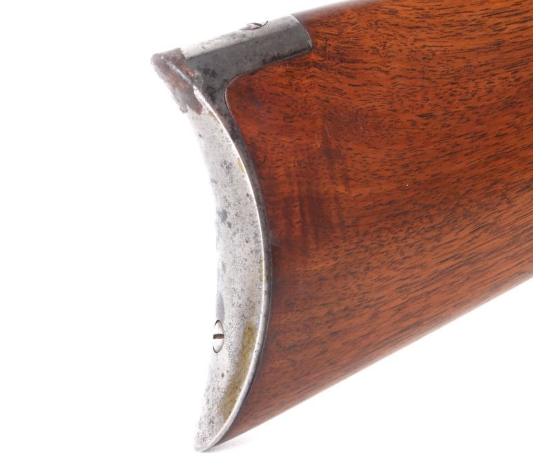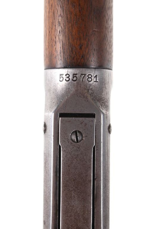 Desirable Special Order 1894 rifle with rare 26” half octagon barrel and half length magazine (often called a “button magazine”),in popular .30 WCF caliber (also known as the .30-30 Winchester Center Fire). This rifle with serial number 535781 left the Winchester factory the year the Titanic sank in 1912. It is important to note that the revolutionary .30WCF round, introduced for the Model 1894 Winchester in the year 1895, was the first sporting cartridge made expressly for smokeless powder and became instantly popular. According to the standard reference The Winchester Handbook by George Madis, only 3,633 rifles were made with half octagon barrels and only 2,671 rifles and carbines combined were made with special shorter magazines. This Pre-World War I production 1894 shows good lightly thinning blue on the 26” half octagon barrel. The receiver shows some aged blue with the balance gray/brown with good blue on the bolt. The butt stock and forend are in generally excellent condition showing only normal light handling. The barrel is fitted with a King marked flat top buckhorn rear sight with notched elevator intact as well as a matching King stamped small blade front sight. Additionally, this early 1894 has sharp and clear correct Winchester markings on the barrel and light 1894 markings on the upper tang. The 1894 was one of the most popular of Winchester’s models and thousands are still used regularly today. The 1894 was also known as the “Klondike Model” as many found their way to the Yukon Gold Rush of the last years of the 1890s and into the 20th century. It was equally popular east and west of the Mississippi and big game hunter/conservationist Theodore Roosevelt was known to have used a Winchester 1894 in .30 WCF caliber very similar to this 1912 manufactured rifle. Roosevelt ordeered a number of Winchester lever action rifles with half-octagon barrels and half-magazines like this one. This example boasts a tight action, strong and secure safety half-cock on the hammer and a bore with fine deep rifling all the way through. Considering its unusual and rare special order configuration, this is a truly scarce 1894. It would be a prize for any Winchester or old West collector. The rifle weighs 7lbs 4oz. Serial Number: 535781. This firearm qualifies as a Curio & Relic firearm, and requires FFL Transfer or NICS Background Check.