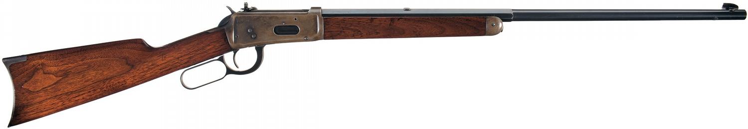 Manufactured in 1920 with a button magazine and half-octagon barrel. Marble Sheard blade front sight and Lyman receiver peep sight with the rear sight removed (Marble's filler block added). The upper left barrel flat is marked with the two line address/patent date, two line nickel steel marking, and "25-35 W.C.F." The factory proof is stamped on top of the barrel and receiver. The upper tang has the three line mode/trademark information and the frame underside has the serial number. Smooth forearm and straight grip stock with forend cap and crescent buttplate.