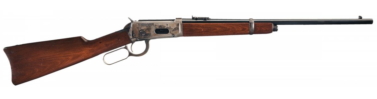 Manufactured in 1911. Pinned blade and folding ladder rear sights with a special order half magazine tube. Barrel has the two line address/patent dates marking and "38-55" on the left side with the factory proof on the barrel and receiver. The upper tang has the three model/trademark information and a saddle staple with ring is mounted on the left side of the receiver. Smooth straight grip stock with crescent buttplate.