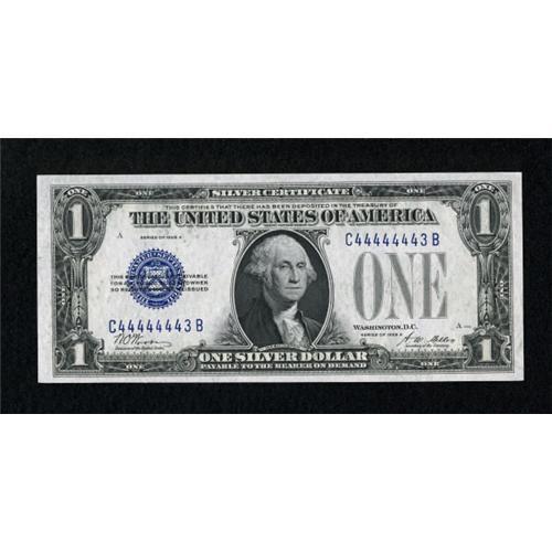 <B>Special Serial Number Fr. 1601 $1 1928A Silver Certificate. Very Choice Crisp Uncirculated.</B></I><BR> This pretty Funnyback is just one digit away from being a solid serial number. It carries an attractive C44444443B.<BR><BR><b>Shipping:</b> Coins & Currency (<a target="_blank" href="http://www.heritageauctions.com/common/shipping.php">view shipping information</a>)