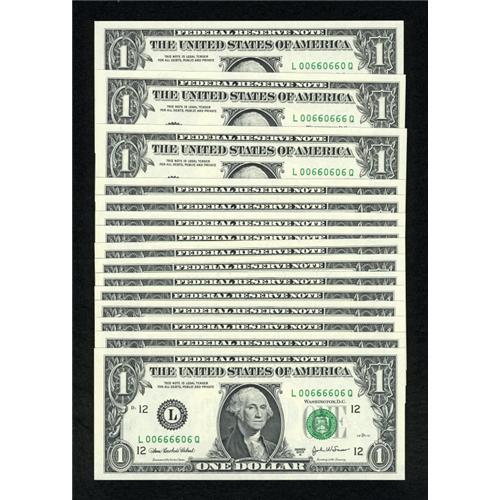 <B>Special Serial Numbers Fr. 1931-L $1 2003A Federal Reserve Notes. Fifteen Examples. Superb Gem Crisp Uncirculated.</B></I><BR> This lot contains an interesting group of fifteen notes that all have serial numbers that contain only "zeroes" and "sixes". A great assortment for the poker player.<BR><BR><b>Shipping:</b> Coins & Currency (<a target="_blank" href="http://www.heritageauctions.com/common/shipping.php">view shipping information</a>)