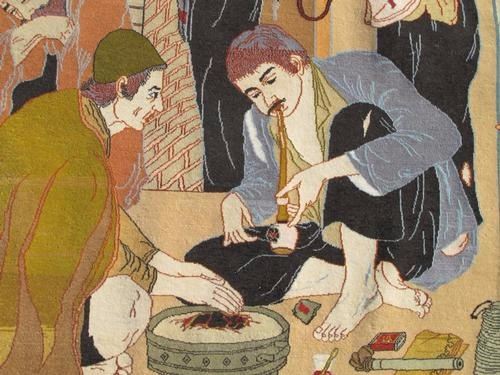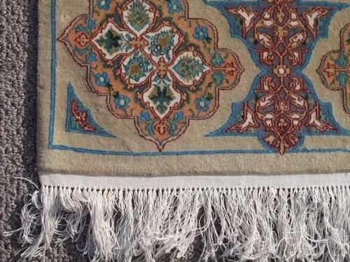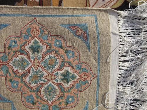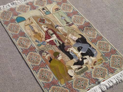 Rug: Rare and Unique Royal Persian Isfahan Rug; Material: Absolute Finest Quality Baby Lamb's Wool/Pure Fine Silk Pile on a Pure Silk; Foundation, all natural vegetable dye; Size: 3.7 x 5.7 feet; Foundation: 100% pure silk; Design: Persian Isfahan; Origin: Iran; Description: Hand woven and signed by the renowned master Persian carpet weaver Ehsan-doost, this beautiful rug depicts the scene of Ghahve-Khane (traditional tea and coffee house) during the Qajar era. In old Iran, Ghahve-Khane was a roofed place for young and old to gather in the afternoon to dine, drink tea, smoke hookah (known as Ghalyoon) and listen to stories from Iranian literature like Ferdowsi's Shahnameh. Capped off beautifully with an intricately detailed vibrant floral trim. This one of a kind fascinating authentic Persian royal Isfahan is truly an investment quality collector's item.
