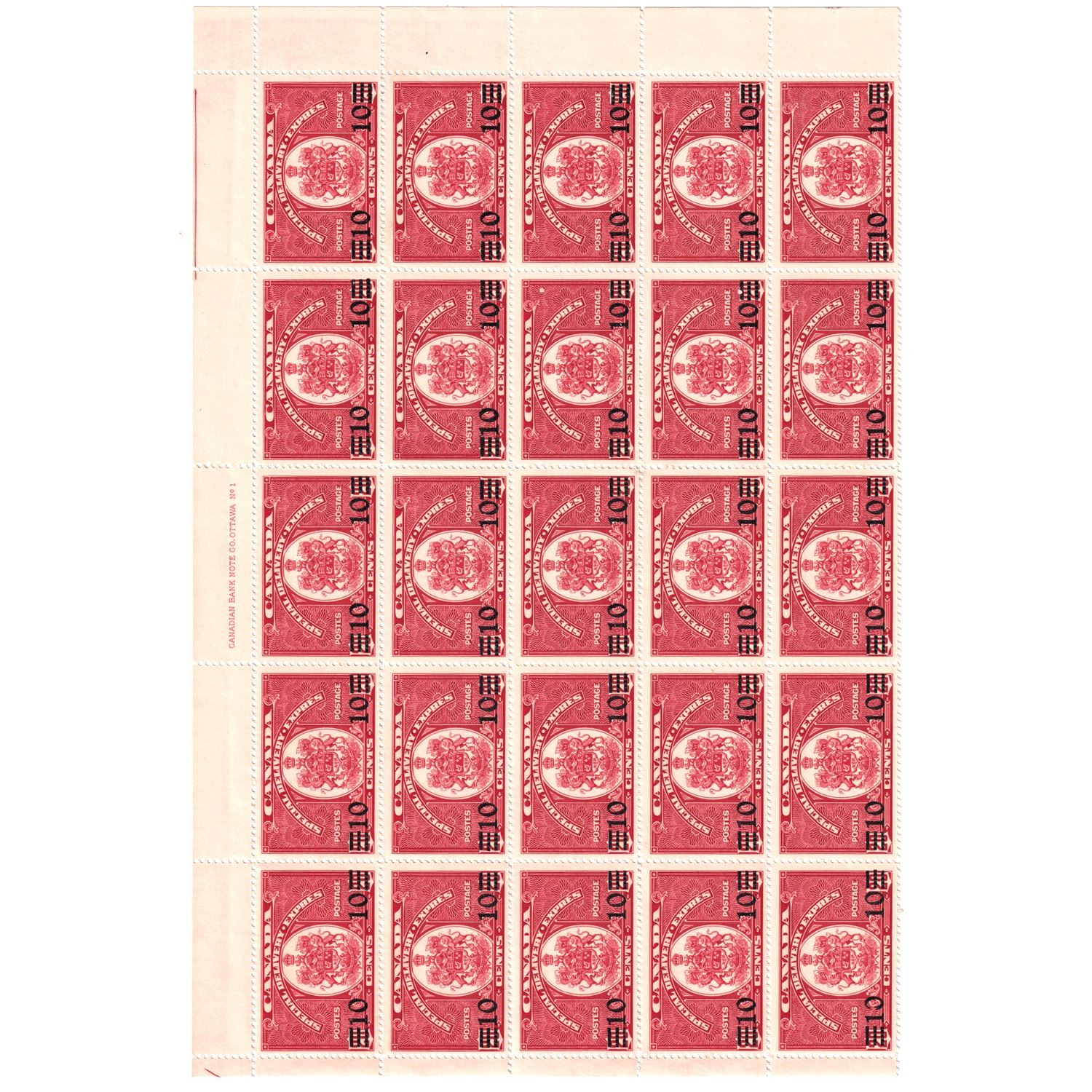 Special delivery #E9 1939 10-cent On 20-cent Mint No Hinge stamps with Various Errors. Sheet contains 1x Broken '0' on the bottom left of the sheet. Broken '1' on the top left, a broken 1 in the second row, second from the left.