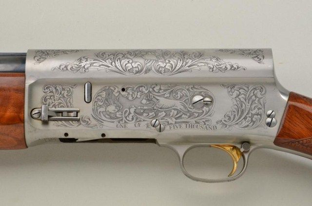 Special limited edition series Browning Auto 5 Classic Model semi-auto shotgun, 12, gauge, 2-3/4” shells, 28” ventilated rib barrel, blue finish with photo-etched game scenes on silver-grey receiver and portrait of JohnBrowning on rear right side of receiver, checkered wood stocks, #211BC1591. This gun is in overall excellent condition showing little use or handling, crisp interior, mirror bore, crisp action, markings andengraving; beautiful wood stocks with fine graining and very crisp checkering; approx. 5,000 made of this Model in 1984. Est.: $800-$1,600.