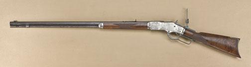 Special order Winchester Model 1873 lever action rifle, 32-20 cal., 30” octagon barrel, full magazine, half nickel finish, set trigger, select checkered wood stocks, long range vernier tang sight, #437333B. Factoryletter confirms caliber, barrel length, set trigger, half nickel finish (stocks and sights not listed); received in warehouse October 8, 1892 and shipped on October 10, 1892. This gun is in overall good conditionshowing traces of blue on the barrel in protected areas with the balance gone to a brown patina; some scattered light to moderate erosion and pinprick pitting with some gripping marks on a couple of areas onthe barrel near the rear sight. The frame shows approx. 30%-50% original nickel that is dulling with some beginning erosion, rust, and pinprick pitting. The stocks are of a 1X-2X grain, nicely checkered in a factorypattern and show nail or stud decoration at the front and rear of the forend. The stocks are well-fitted and appear to be a Winchester product. The rear sight shows considerable original blue turning brown and