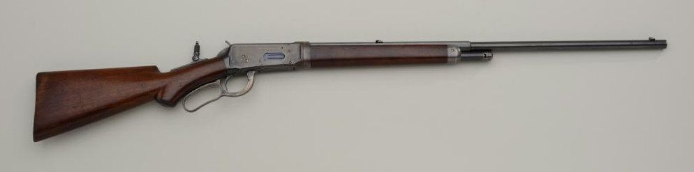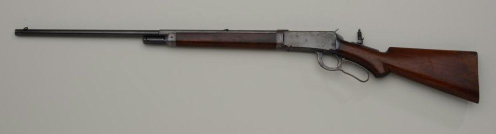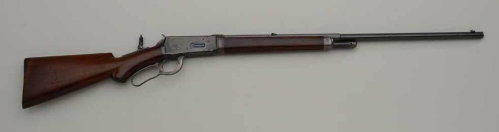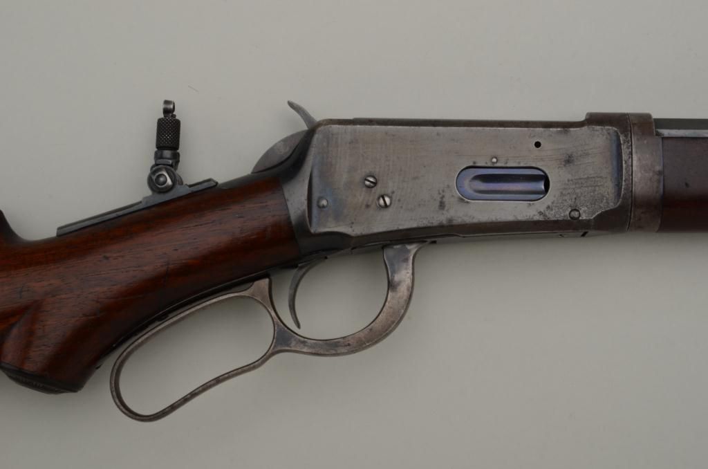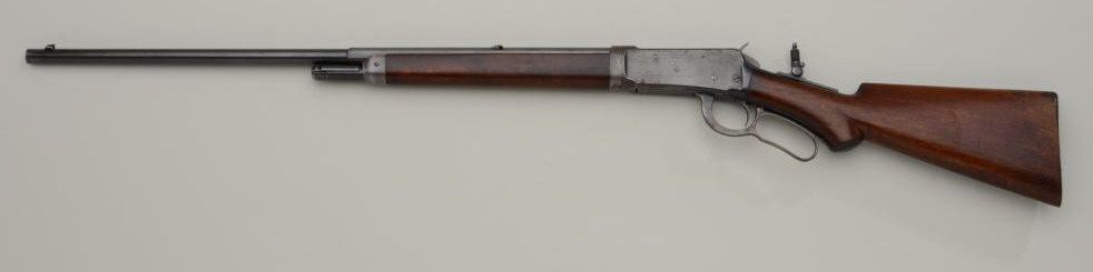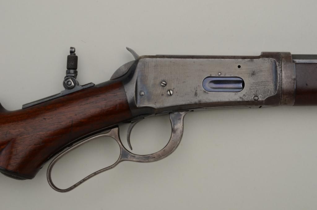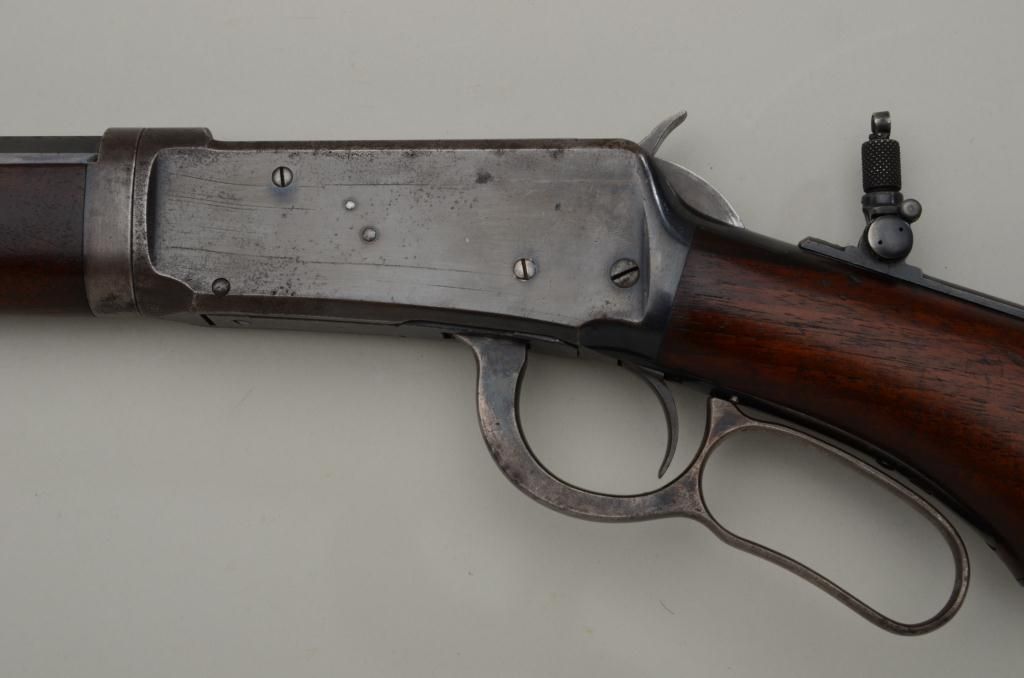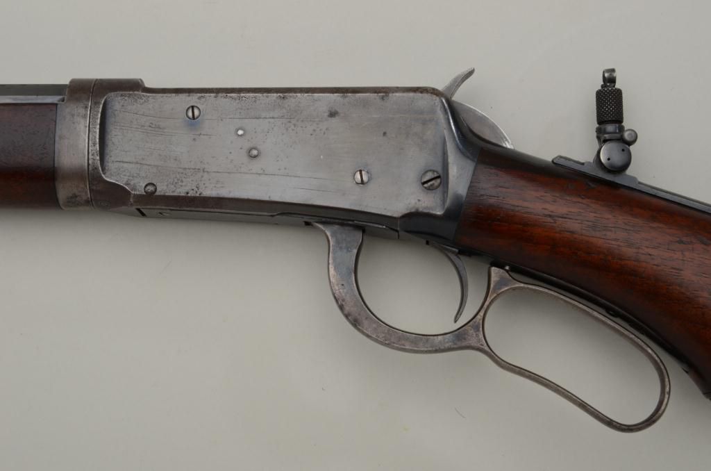 Special order Winchester Model 1894 lever action takedown rifle, .30 W.C.F. cal., 26” half round/half octagon barrel, ½ magazine, blue finish, semi-pistol grip, shotgun butt stock, #94042. This gun is in overall verygood to fine condition showing the majority of its original blue finish, very good bore, crisp action and markings, very good wood with some loss to finish at butt plate and minor old scattered mars and scratches fromstorage; adjustable Lyman tang sight; a nice early special features ’94. Est.: $3,200-$4,500.