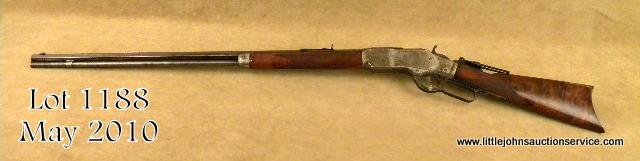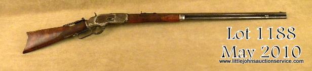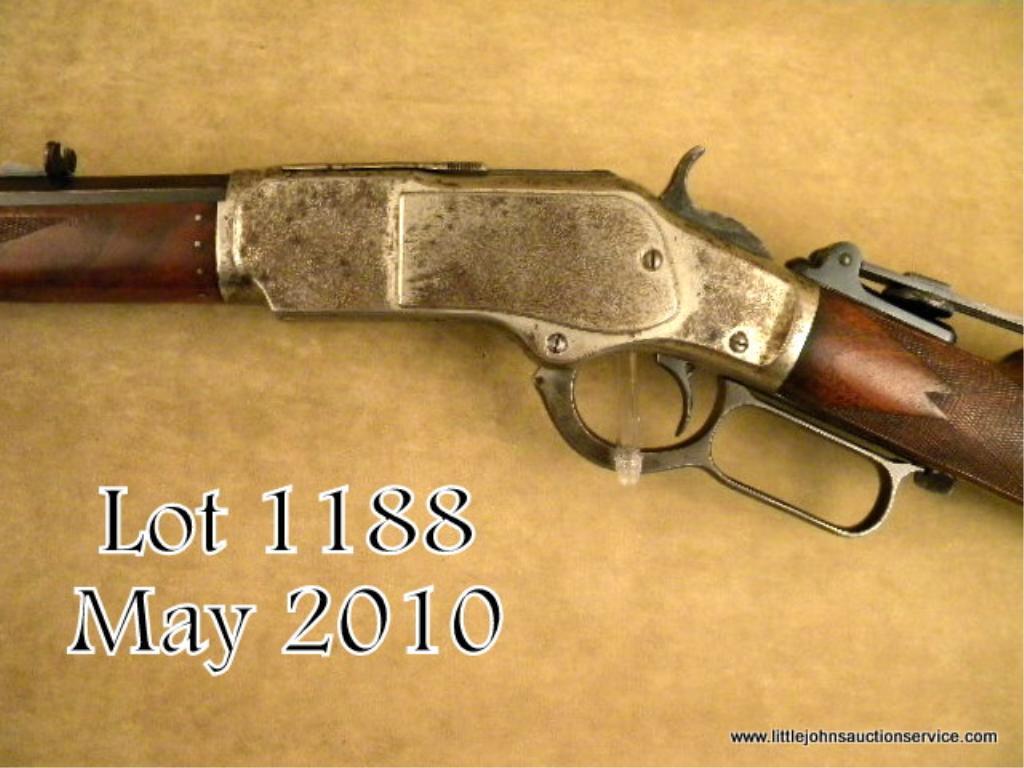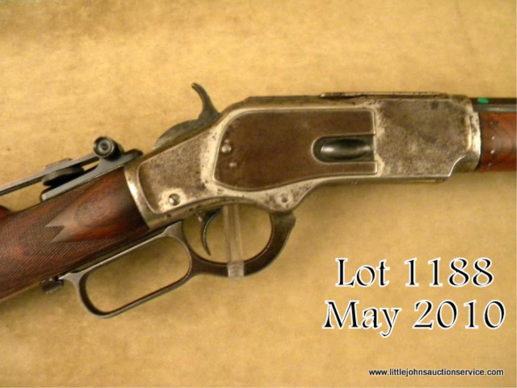 Special order Winchester model 1873 lever-action rifle, .32-20 caliber, 30" octagon barrel, full magazine, half nickel finish, set trigger, select checkered wood stocks, long range veneer tang sight, serial number 437333B, with factory letterconfirming caliber, barrel length, set trigger, half nickel, but stocks and sights not listed. The barrel shows 20-40% blue within a browning patina and the magazine tube shows some traces of blue, mostly going to grey. Some scattered light tomoderate erosion and pinprick pitting, and some gripping marks on a couple of areas on the barrel near the rear sight. The frame shows 30-50% original nickel that is dulling with some beginning erosion, rust, and pinprick pitting. The stocks are of a 1-2X grain, nicely checkered in a factory pattern, and show nail or stud decoration at the front and rear of the forend. The stocks are well fitted and appear to be a Winchester product. The rear sight shows considerableoriginal blue turning brown and is an old sight, probably dealer added or supplied. The markings are sharp, the action is good, the bore is very good. A nice looking extra-long '73 with a lot of features and a great look. Est: $5,000 - $9,000