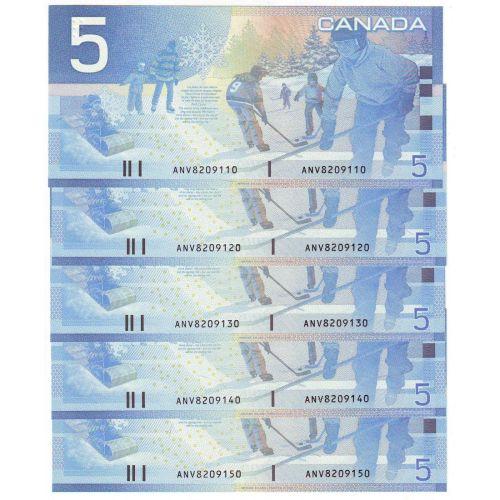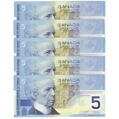 Bank of Canada, Special series of 5 x $5.00 note 2001, grade UNC-65, Charlton # BC-62a, signature Knight Dodge, serial ANV8209110, ANV8209120, ANV8209130, ANV8209140 & ANV8209150. Lot of 5 notes.