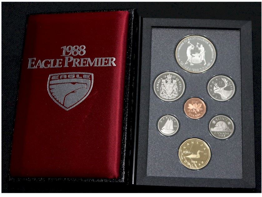 Specialized RCM Issue; 1988 Canada Eagle Premier Double Dollar Set issued by the Royal Canadian Mint. Logo is imprinted on the inside cover of the set.