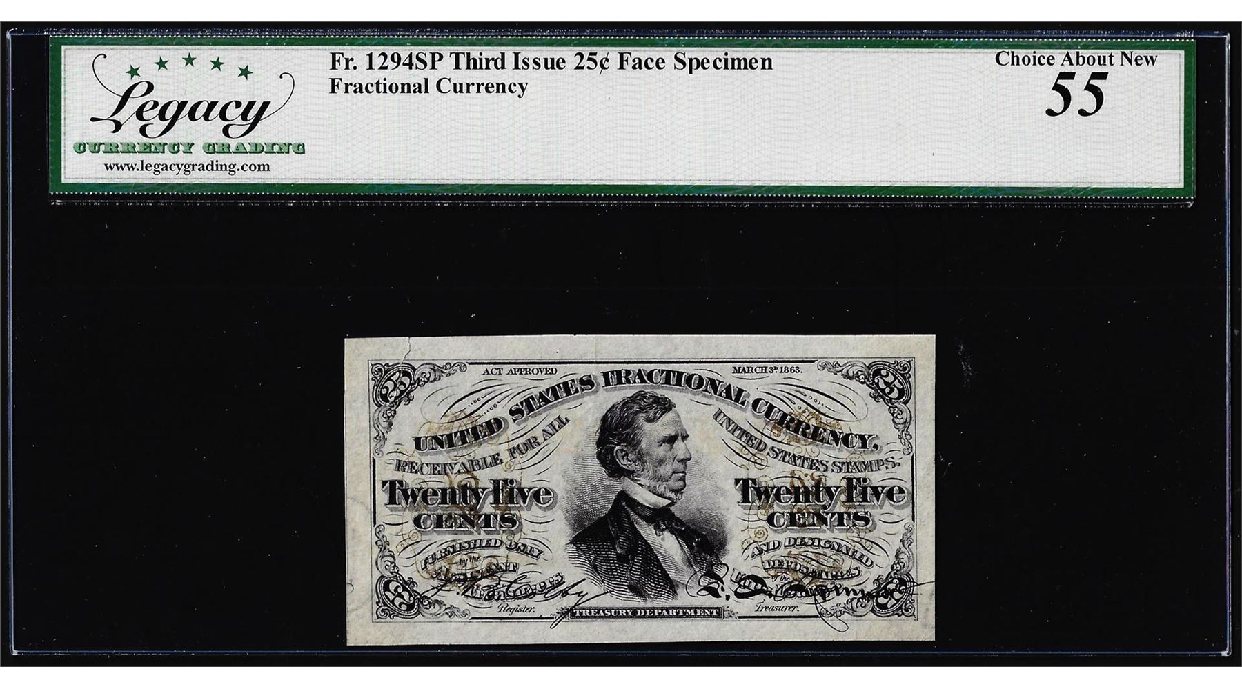 One Specimen 1863 3rd Issue 25 Cents Fractional Note Fr.1294SP Legacy Choice About New 55. Legacy Graded.