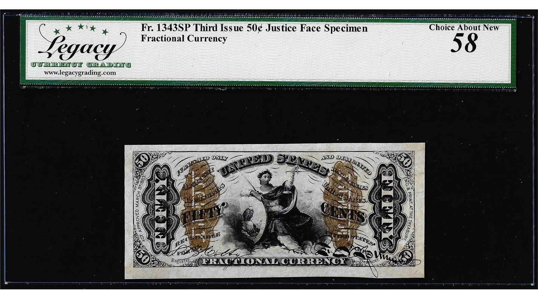 One Specimen 1863 Third Issue 50 Cents Fractional Note Fr.1343SP Legacy About New 58. Legacy Graded.