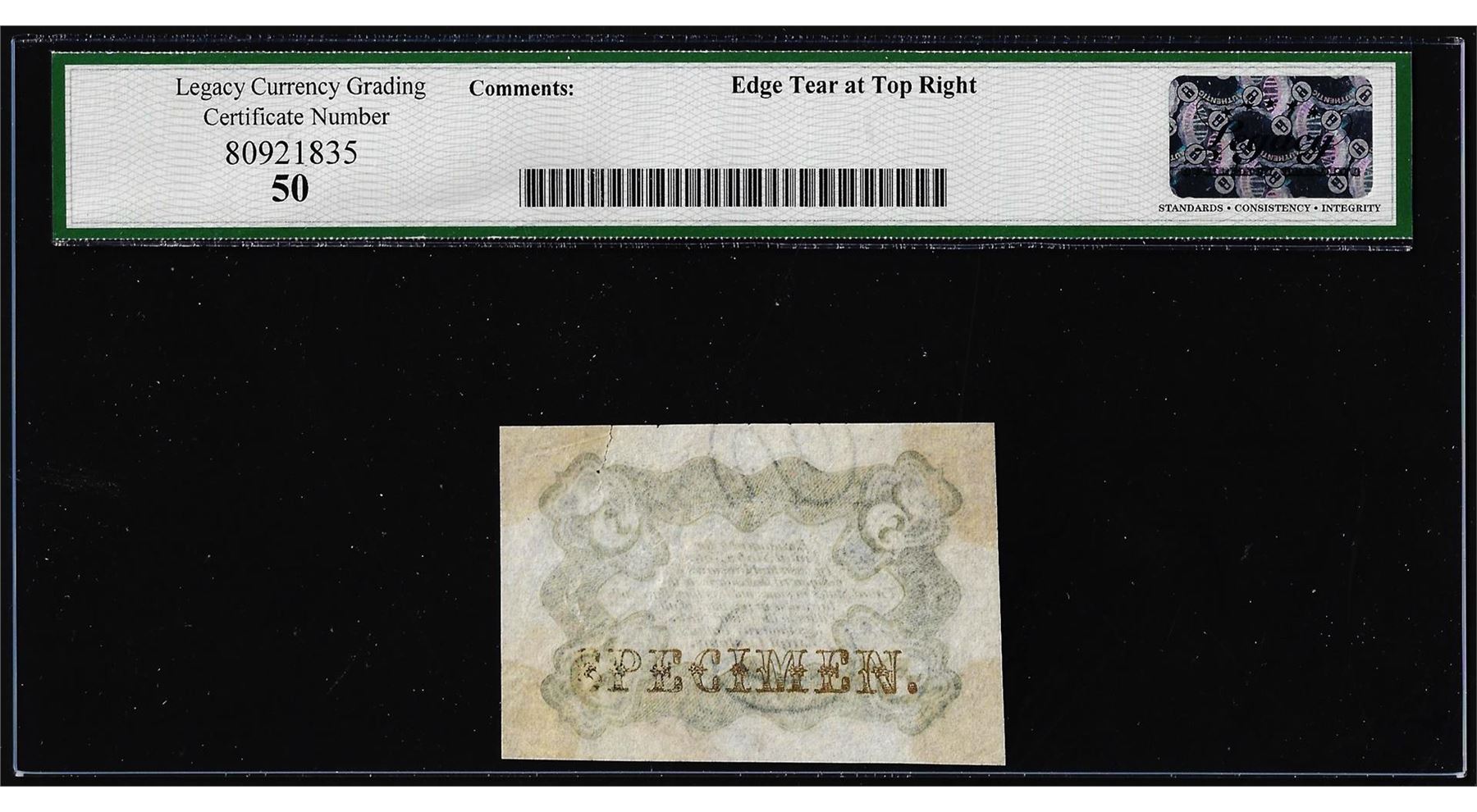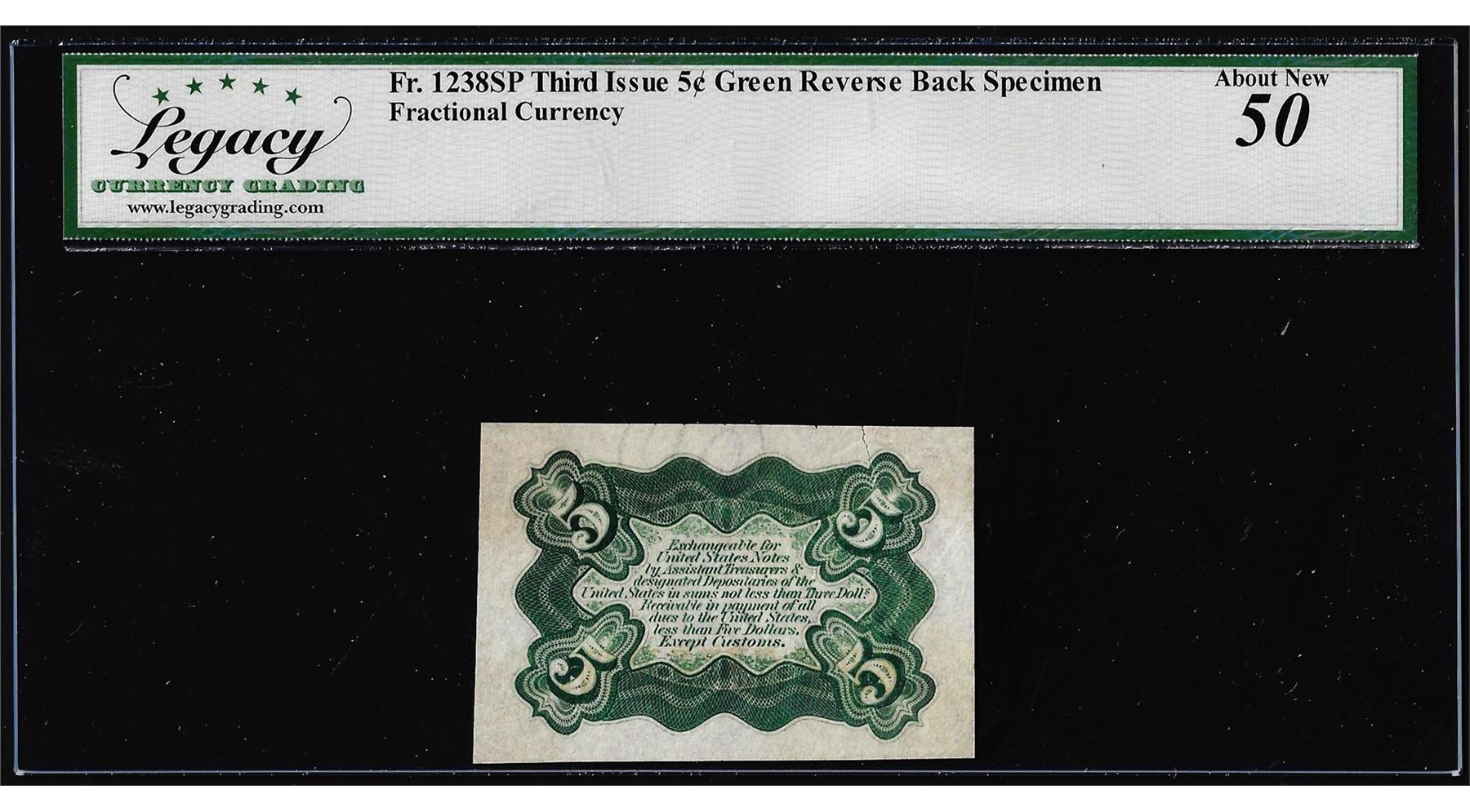 One Specimen 1863 Third Issue Five Cents Fractional Note Fr.1238SP Legacy About New 50. Legacy Graded.