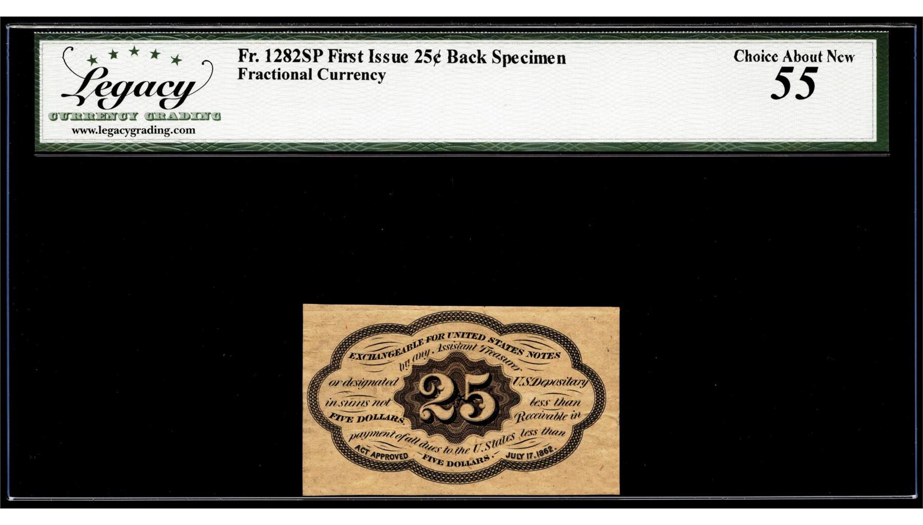 One Specimen 1st Issue 25 Cent Fractional Currency Note Fr.1282SP Legacy Ch. About New 55. Legacy Graded.