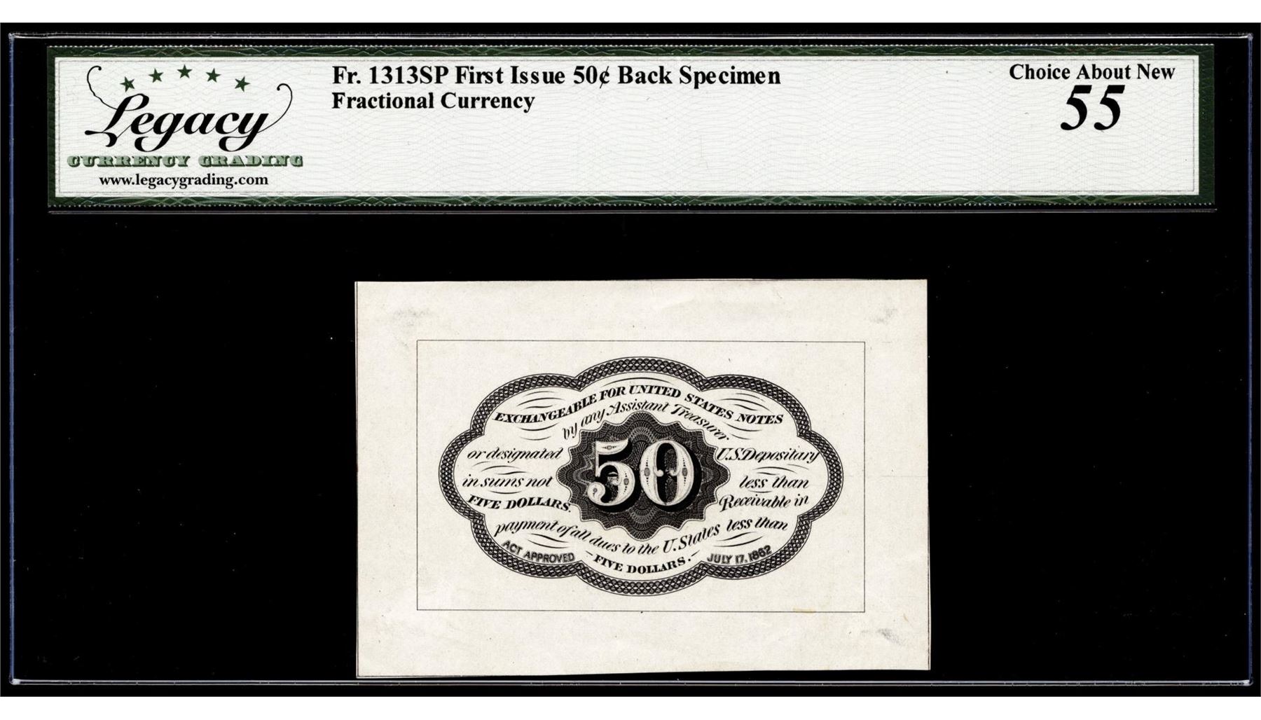 One Specimen 1st Issue 50 Cent Fractional Currency Note Fr.1313SP Legacy Ch. About New 55. Legacy Graded.
