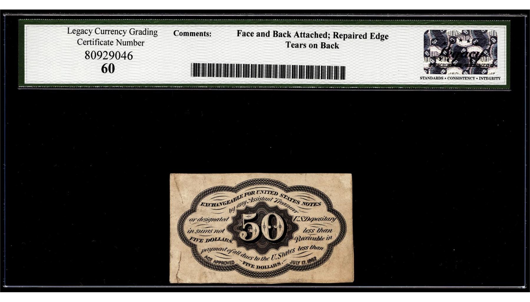One Specimen 1st Issue 50 Cents Fractional Currency Note Fr.1313SP Legacy New 60. Legacy Graded.