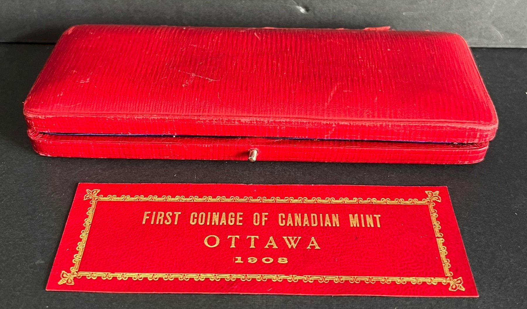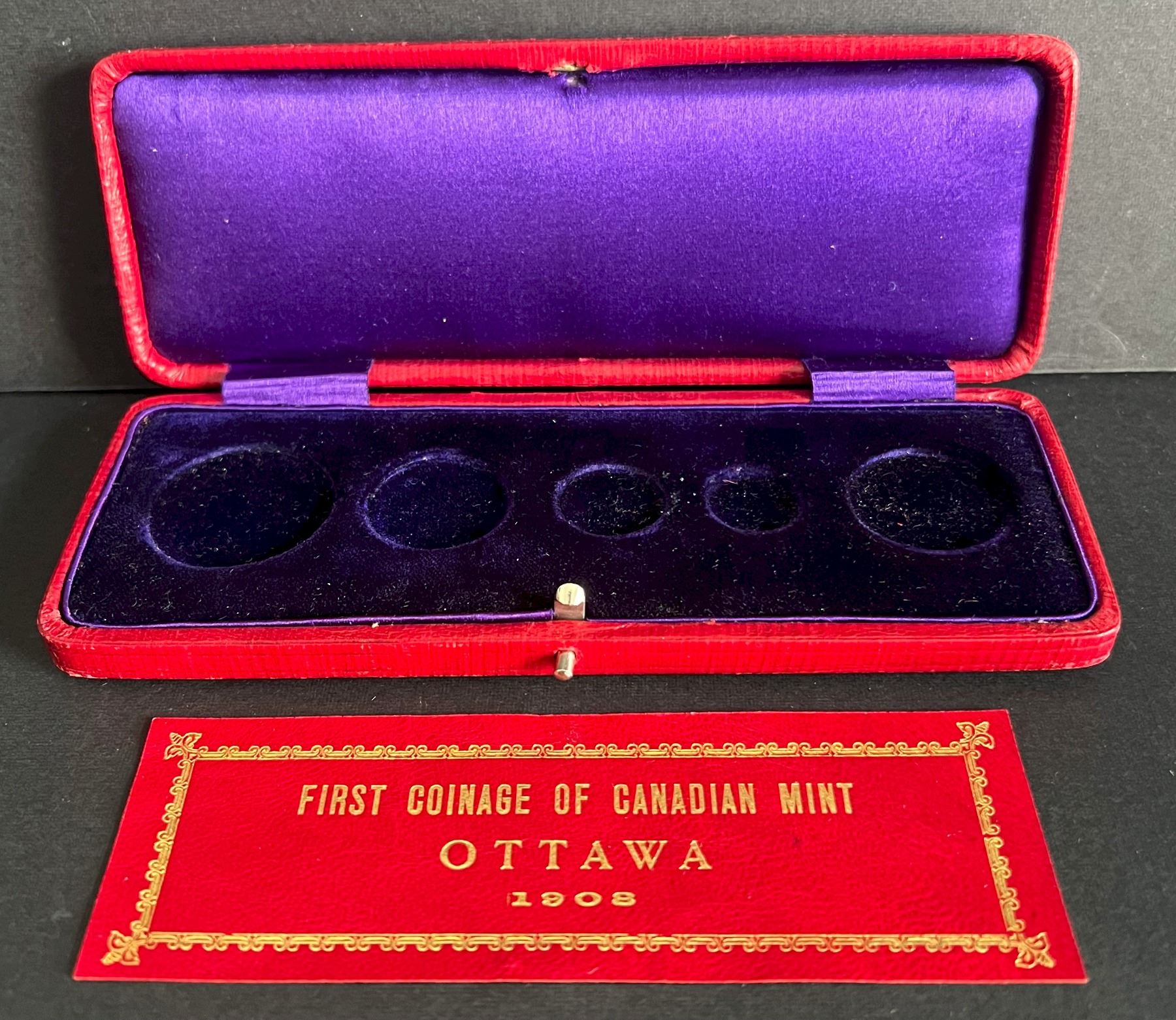 Specimen Box; 1908 Case 6b - 5 Coin Red Leather case. Note that the exterior leather strip with the top impressed in gold letter is included w/case.