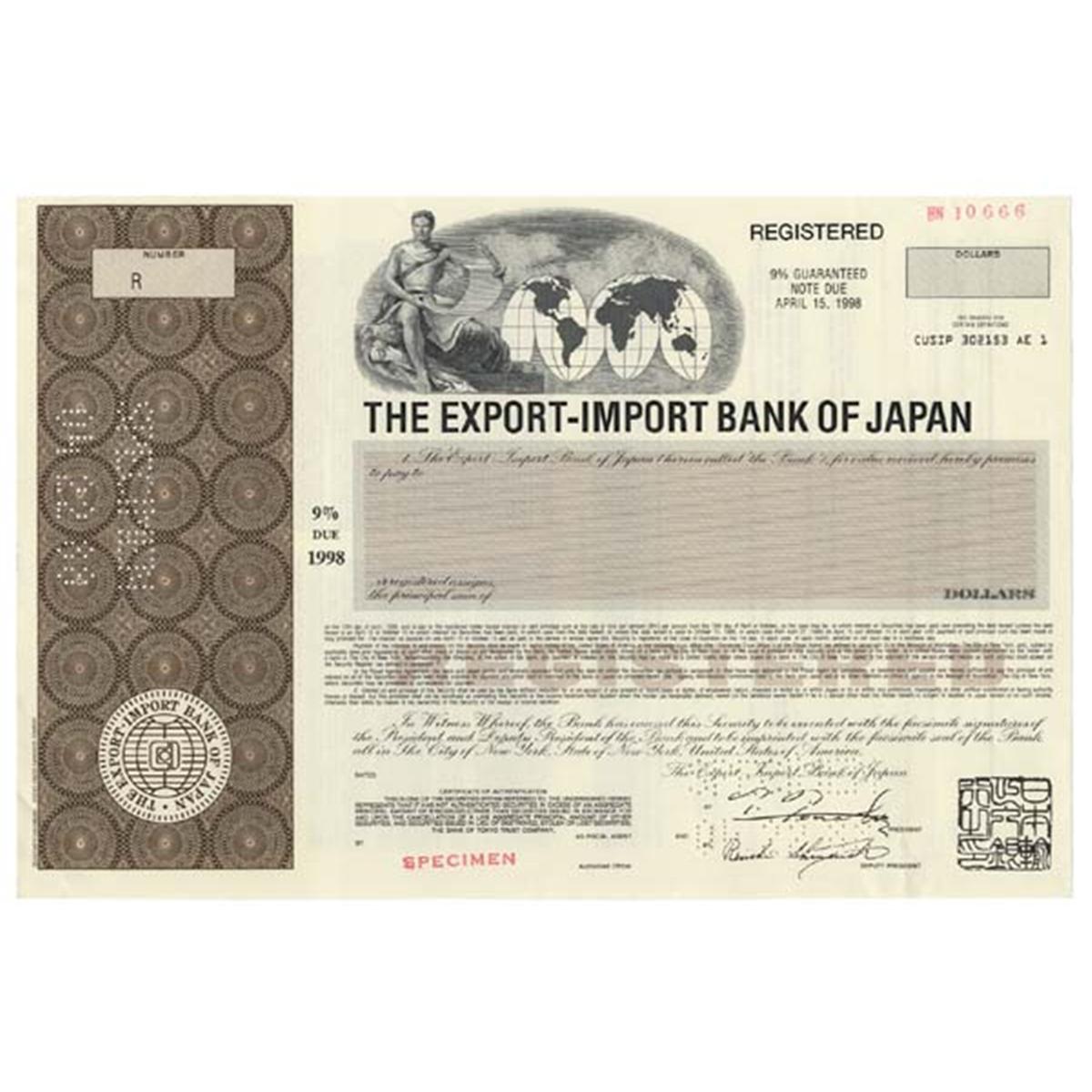 New York. Specimen bond. Brown. Large top center vignette of an allegorical male. Lightly punch cancelled and stamped “specimen” at lower left. A rare Japanese banking bond. Excellent