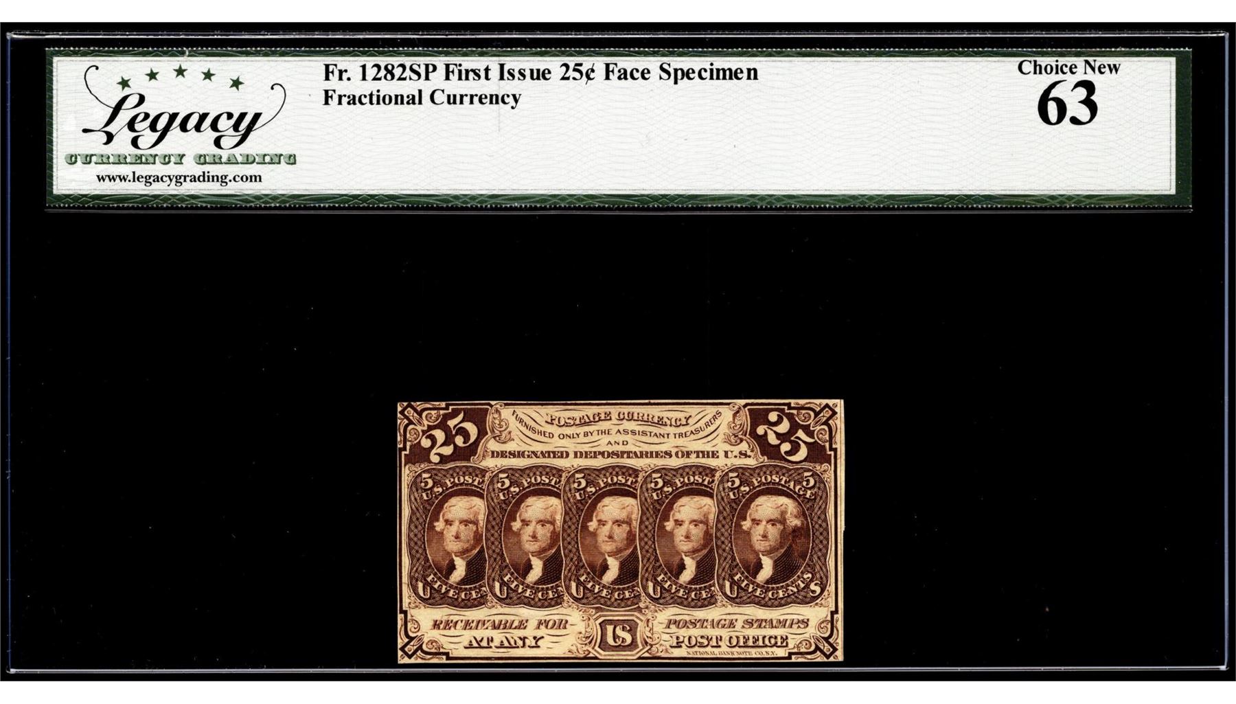 One Specimen First Issue 25 Cents Fractional Currency Note Fr.1282SP Legacy Choice New 63. Legacy Graded.