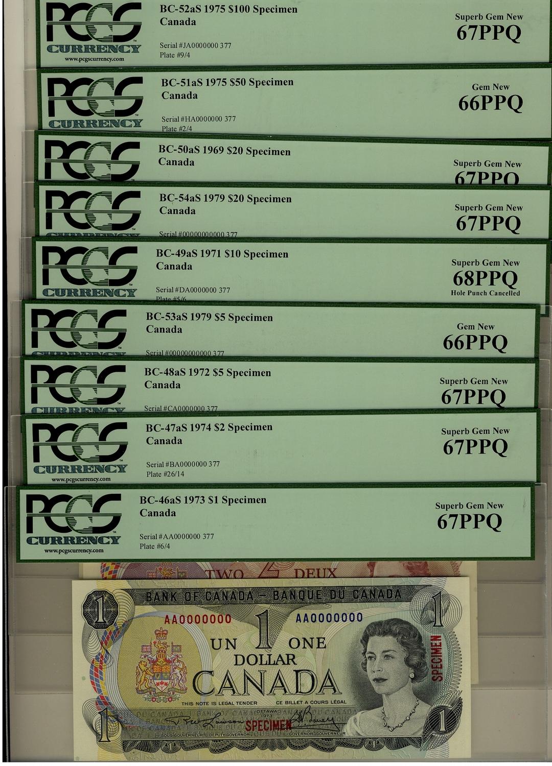 Specimen Multi Colour Series #377. BC-46aS UNC67, BC-47aS UNC67, BC-48aS UNC67, BC-53aS UNC66, BC49aS UNC68, BC-54aS UNC67, BC-50aS UNC67, BC-51aS UNC66 & BC52aS UNC67. Lot includes 8 notes all Gem to Superb Gem by PCGS standards.