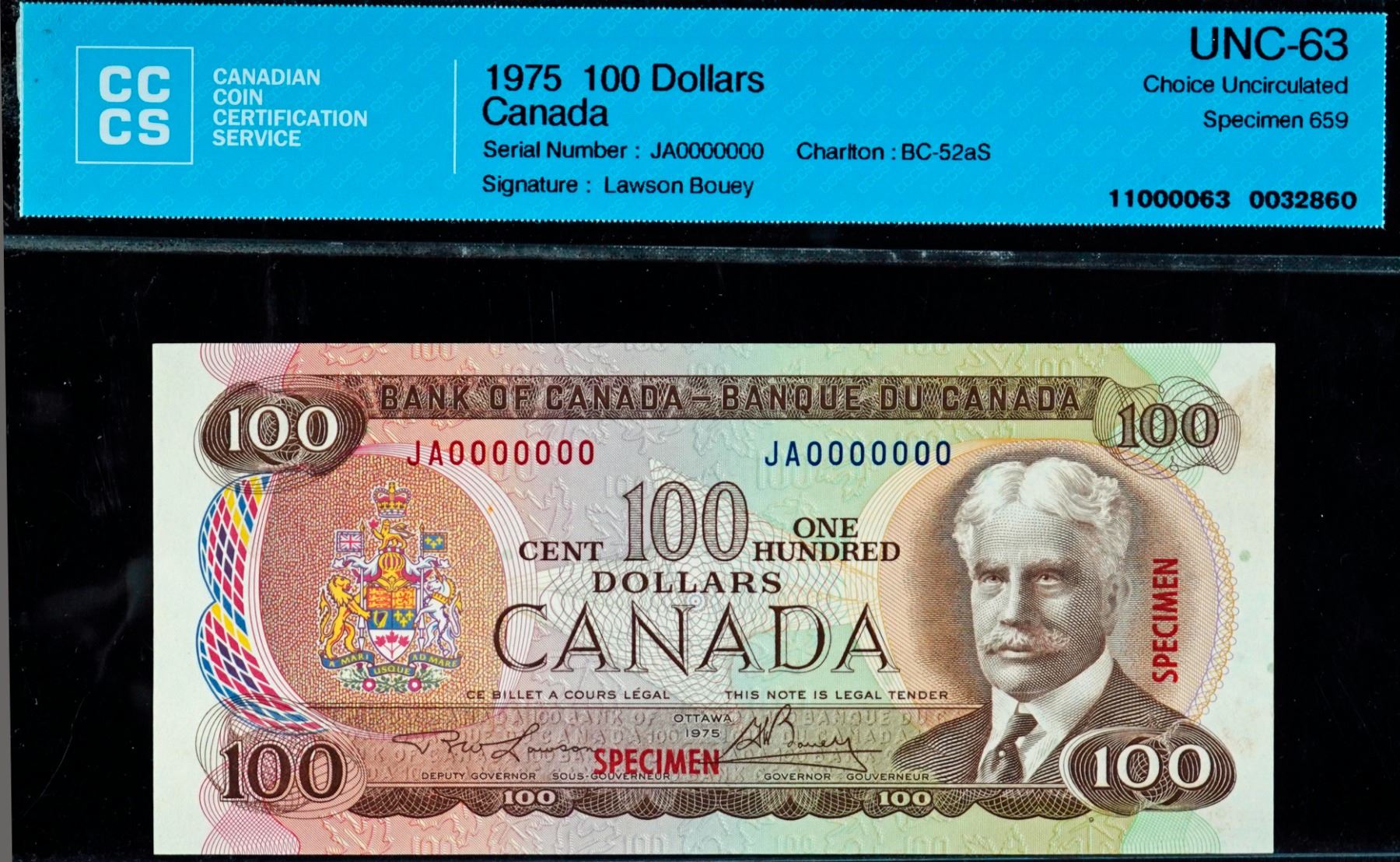 Specimen Note;  1975 $100 BC-52aS #JA0000000, CCCS Choice Uncirculated-63 Specimen #659.