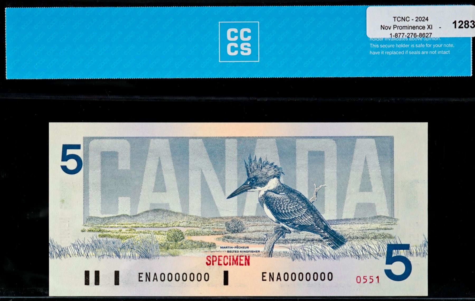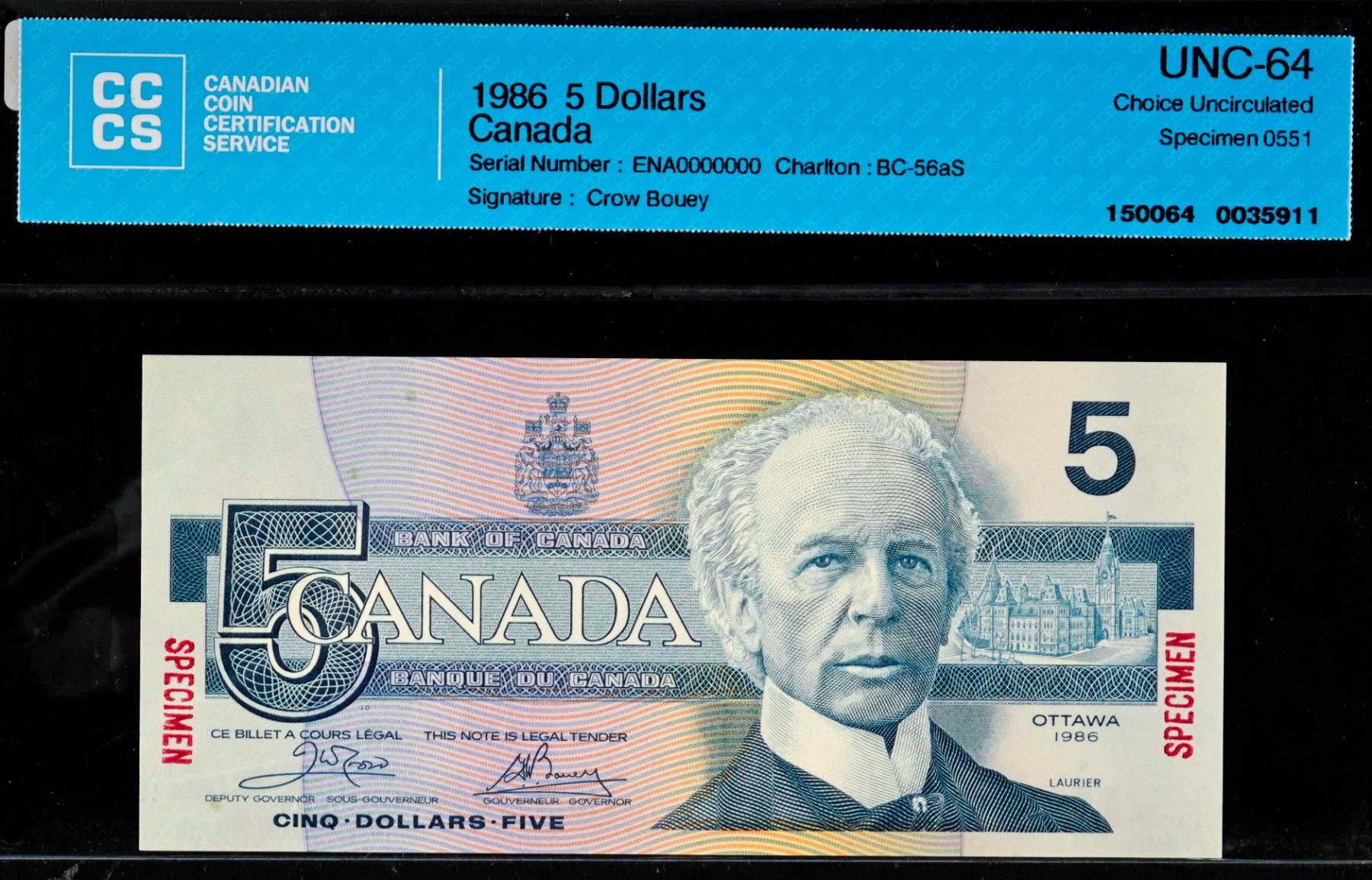 Specimen Note; 1986 $5 BC-56aS #ENA0000000, CCCS Choice Uncirculated-64 Specimen 0551.