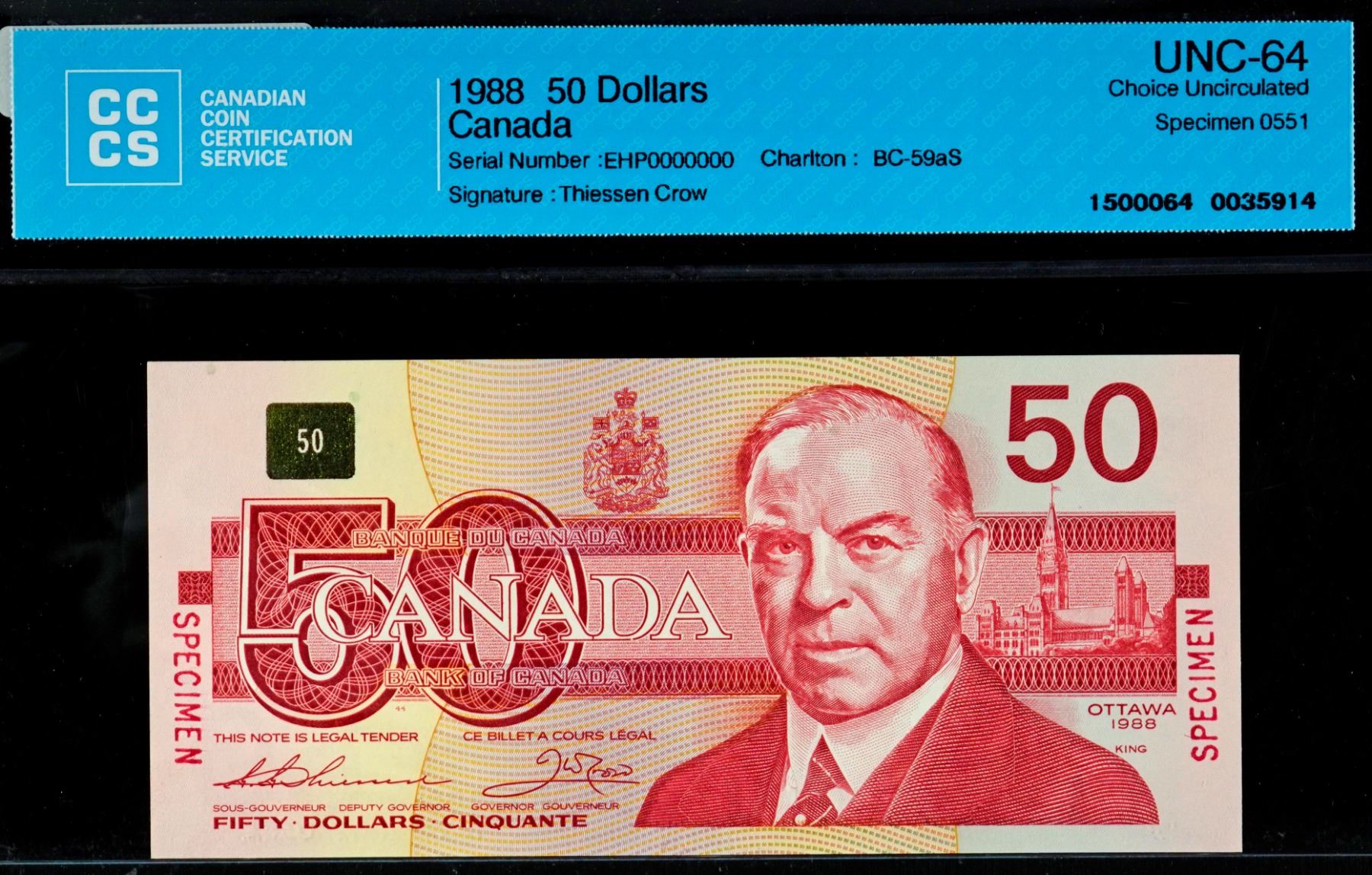 Specimen Note; 1988 $50 BC-59aS #EHP0000000, CCCS Choice Uncirculated-64 Specimen 0551.