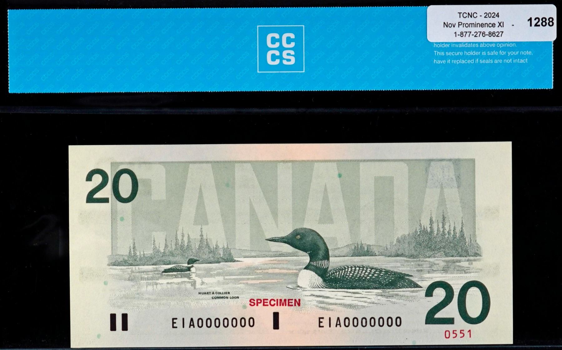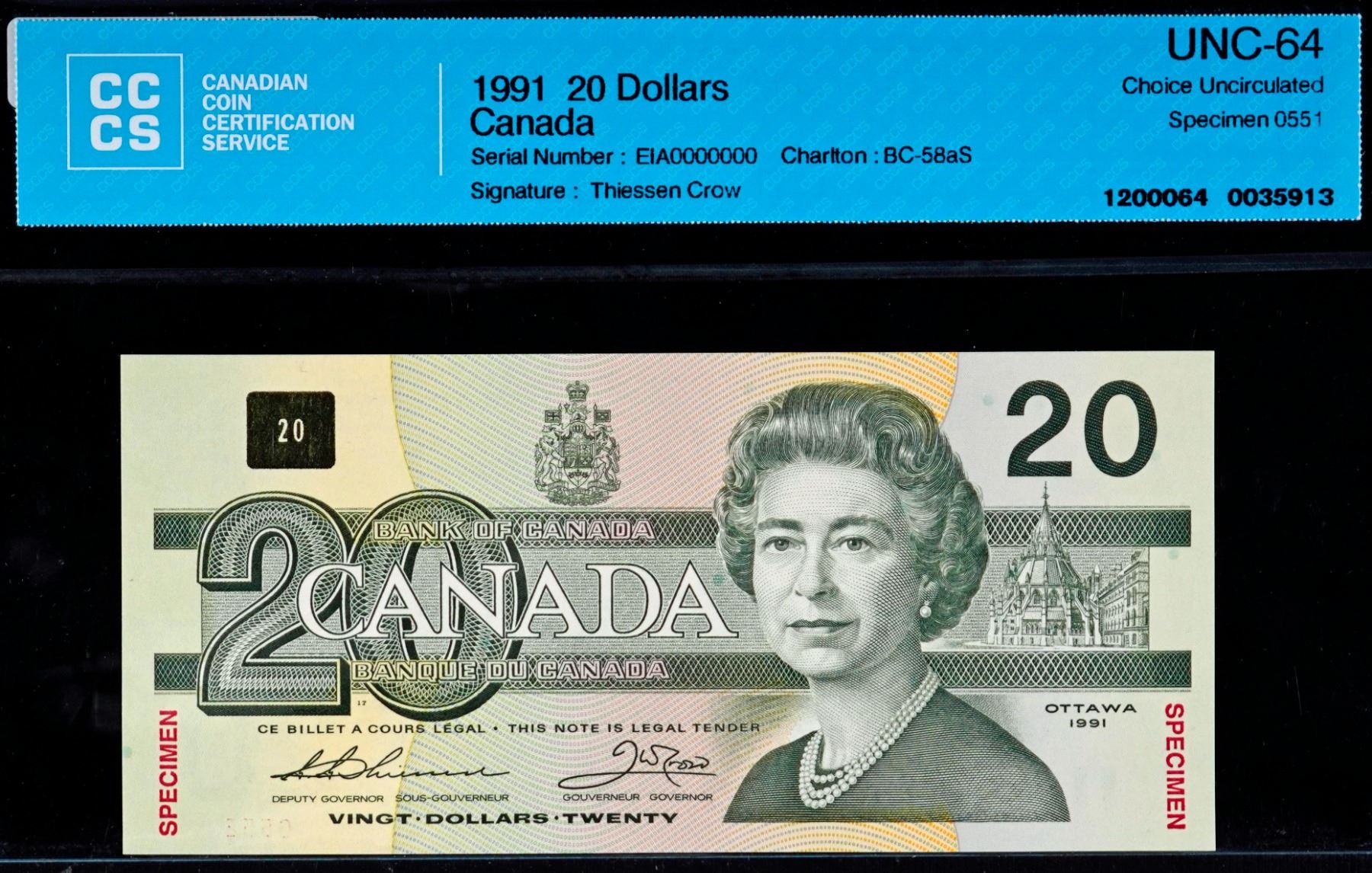 Specimen Note;  1991 $20 BC-58aS #EIA0000000, CCCS Choice Uncirculated-64 Specimen 0551.