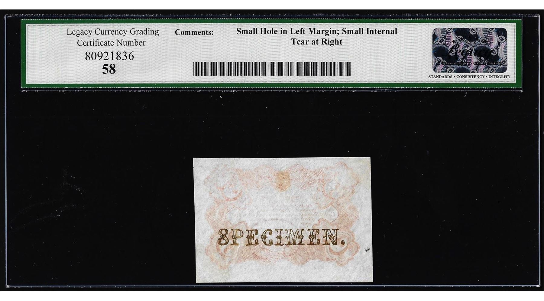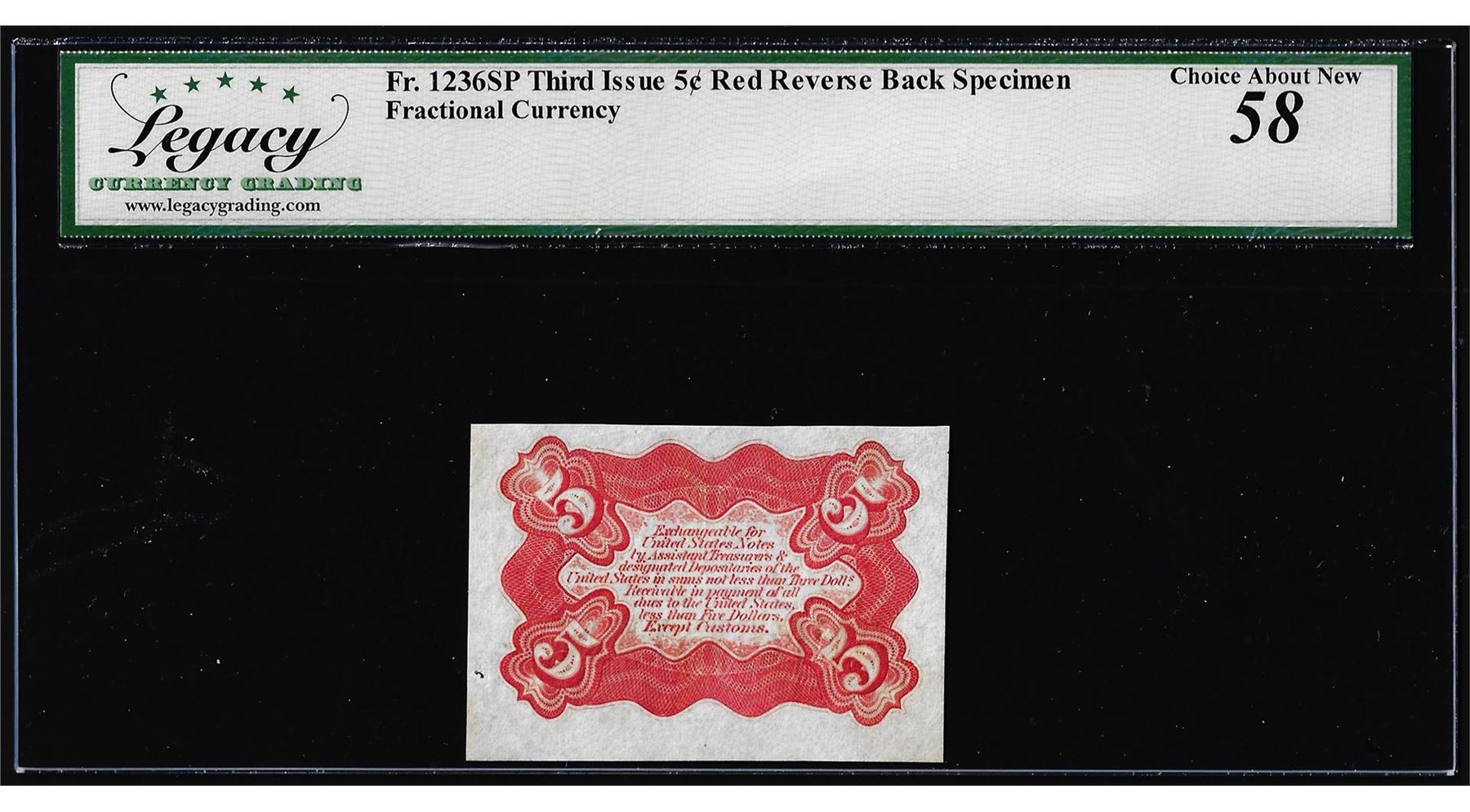 One Specimen Third Issue Five Cents Fractional Note Fr.1236SP Legacy Choice About New 58. Legacy Graded.