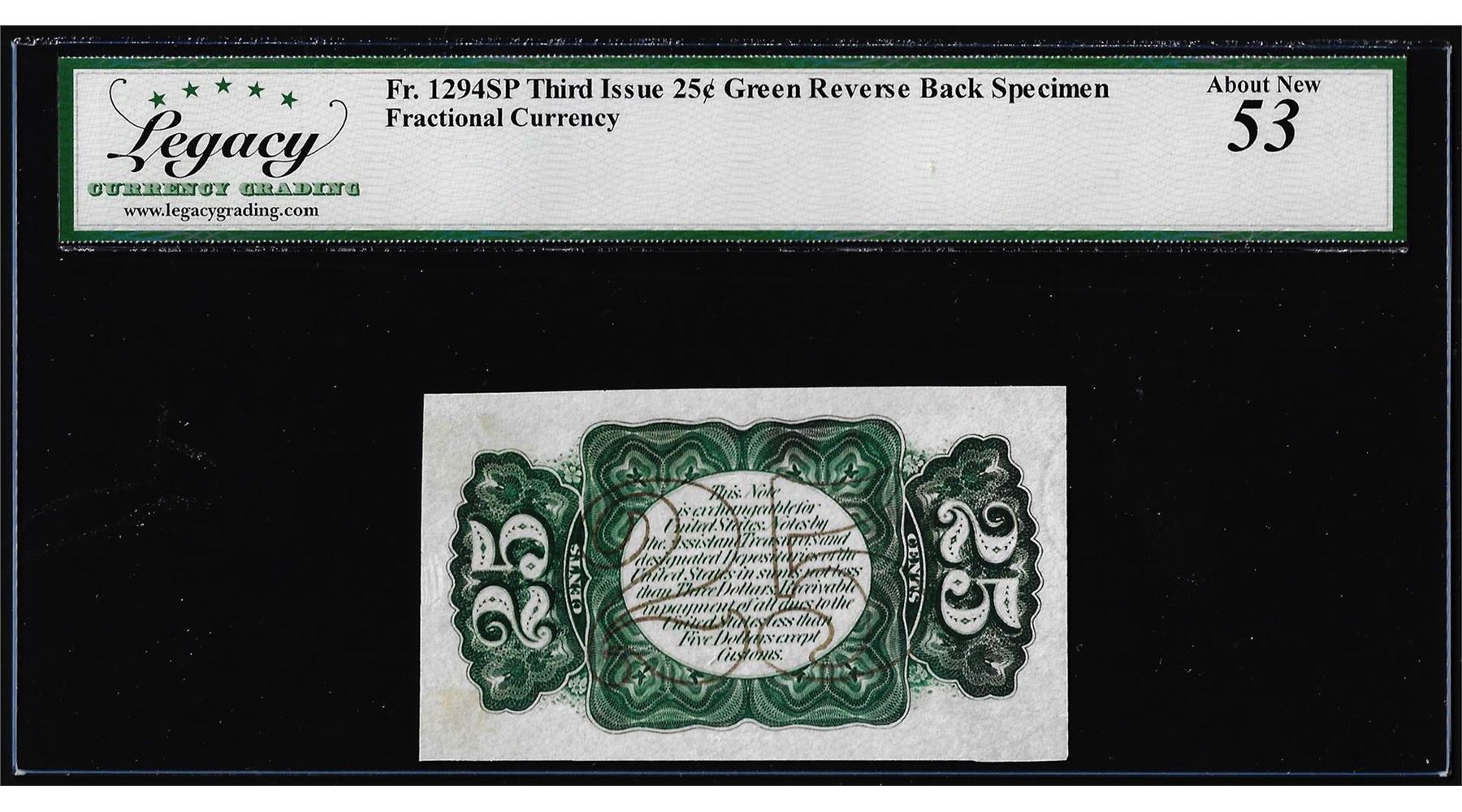 One Specimen Third Issue Twenty-Five Cents Fractional Note Fr.1294SP Legacy About New 53. Legacy Graded.