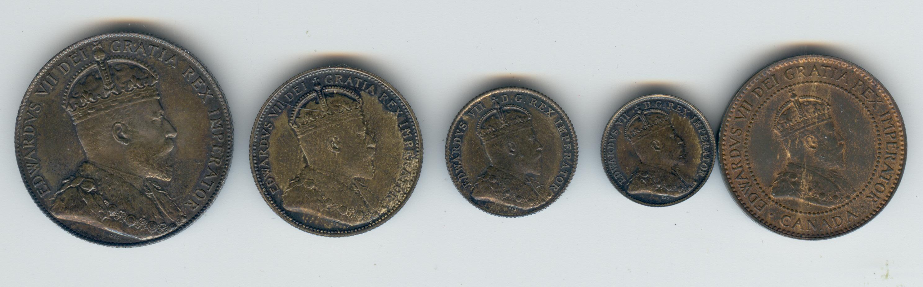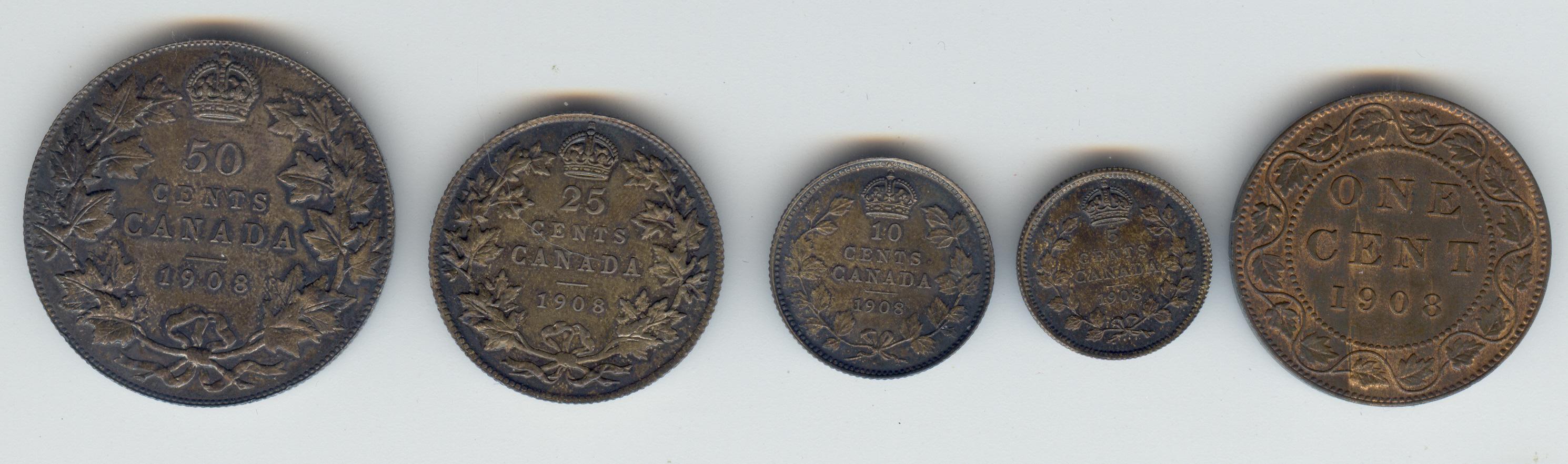 1908, 1 Cent to 50 Cents with Small 8 5 Cents in case of origin. Cent Red & Brown and silver coins are toned.