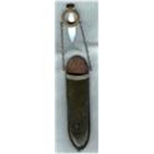An English leather and sterling silver chatelaine clip with glasses carrier. The chatelaine clip top is marked on the back of the tonge CS*FS (CS star FS)"N" for 1897 and the lion rampant. The leather spectacle carrier is banded in sterling and is markd CS*FS the lion the Chester mark and "N" for 1897. The total length is 10" There is ver slight shrinkage to the leather.