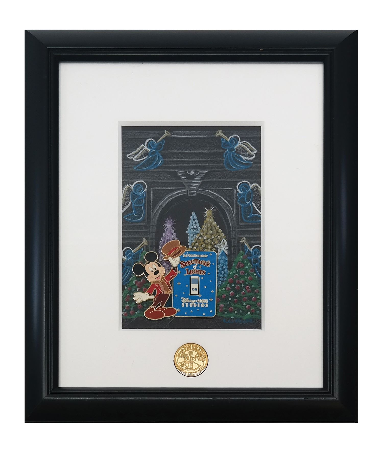 (Disney-MGM, 2002) A limited edition framed pin based on the Osborne Spectacle of Lights. The pin features Mickey and is placed over original pastel artwork for the attraction. The pin comes framed with a medallion on the bottom. The pin was limited to only 12 pieces, and the framed set measures 12"x10". The items are in fine condition with minor wear to the frame.