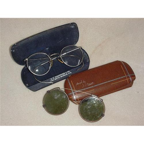 A pair of early 20th century eyeglasses with glass lenses with bifocals and white gold filled frames. Original case signed glasses by Hantover. Also, and in they're own case, a pair of clip on sunglasses with green glass lenses that clip onto the frames. Great for the eyeglass collector.