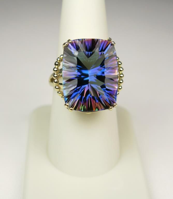 Spectacular 10 karat yellow gold ladies handmade ring set with a custom cut Mystic topaz weighing approx. 20.00 carats. Retail $1,000-$1,500 Estimate $600-$900 Nice
