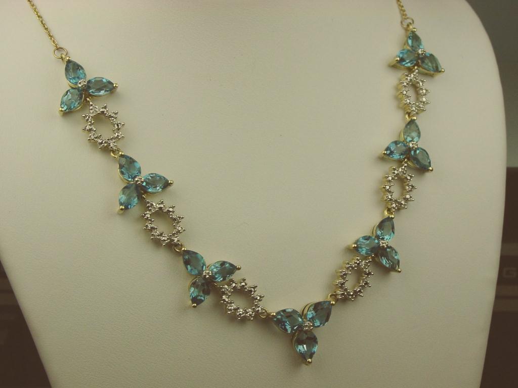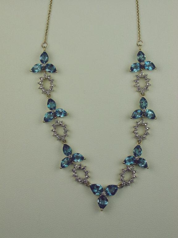 Spectacular 10K YG Ladies Custom Necklace Fine set with 21 pear shape London blue Topaz weighing approx 6.00 carats and side pave set diamonds. Retail $2,250.00.Fine set with 21 pear shape London blue Topaz weighing approx 6.00 carats and side pave set diamonds. Retail $2,250.00.