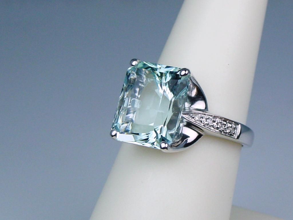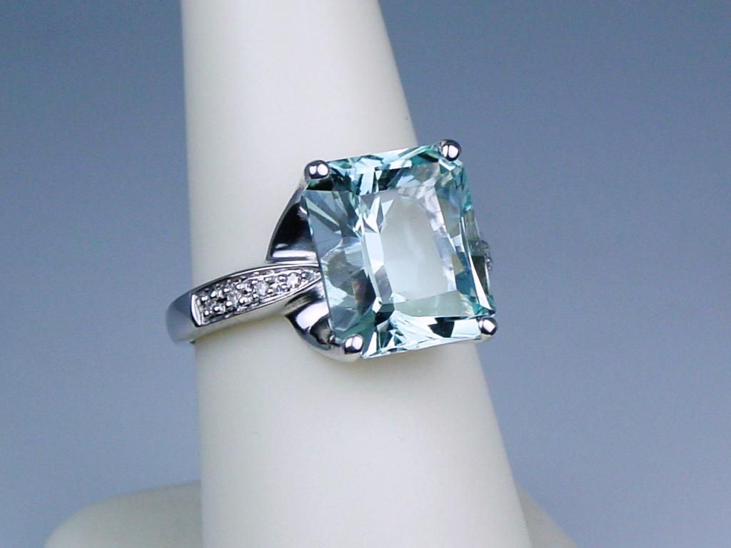 Spectacular 14 karat white gold custom made ladies ring set with a fine Aquamarine weighing 6.41 carats and side diamonds cut by American stone cutter ‘Lisa Appert’. Retail $2,000-$2,500 Estimate $1,000-$1,500 A fineitem