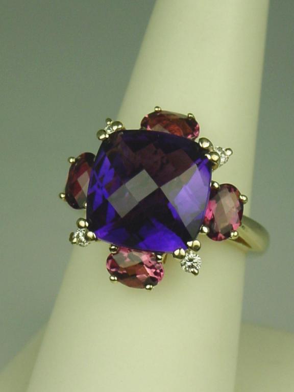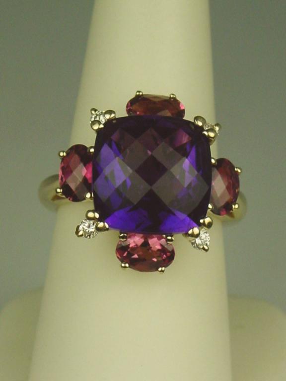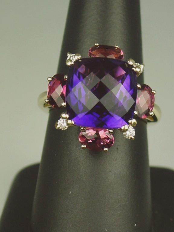 Spectacular 14 karat yellow gold ladies custom design ring set with a center fine checkerboard cut intense purple Amethyst weighing approx. 8.00 carats with fine side tourmalines and diamonds. Retail $2,750.00Estimate $800-$1,500