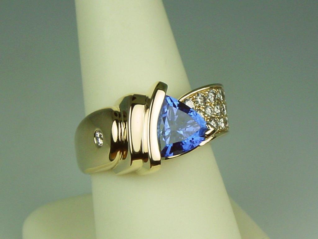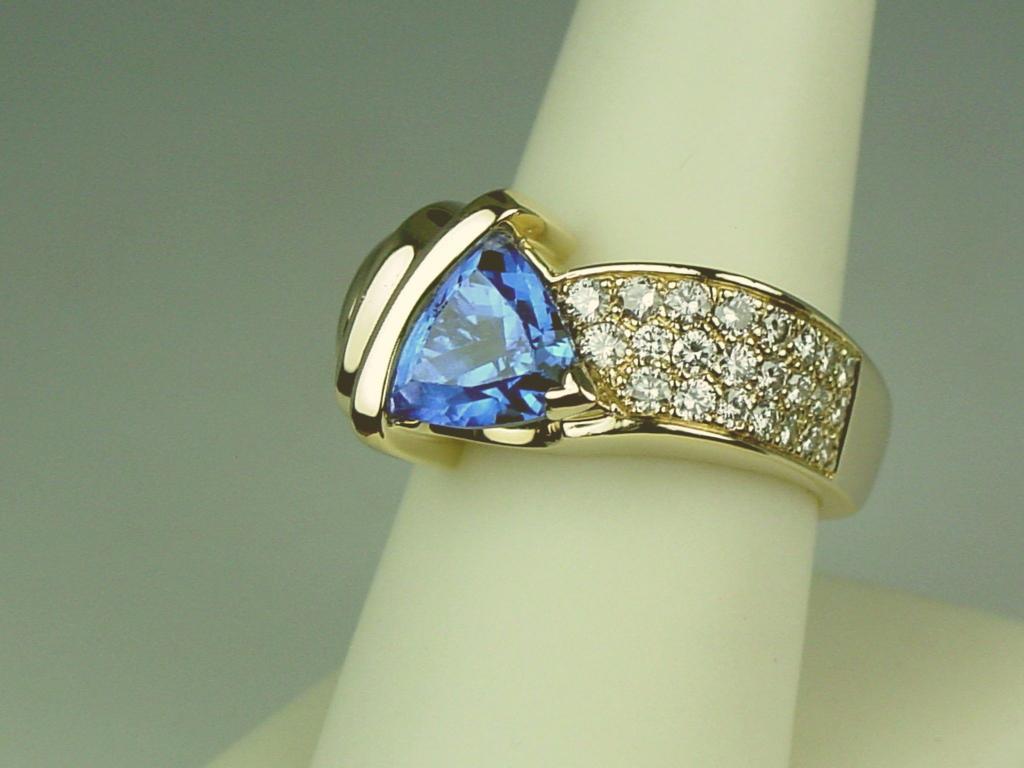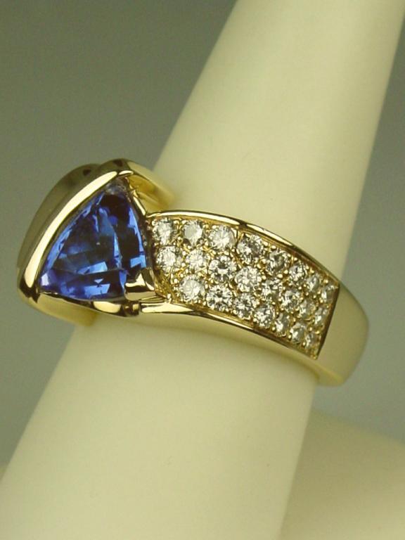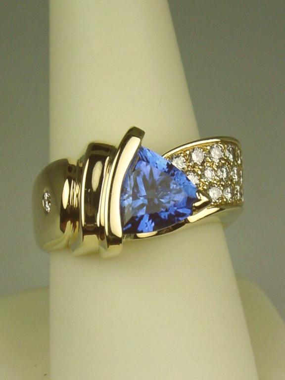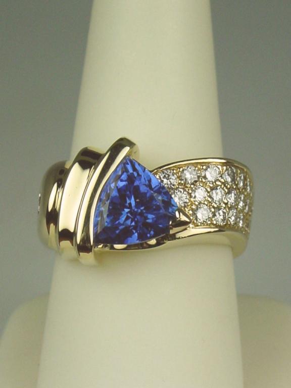 Spectacular 14 karat yellow gold very heavy ladies custom made signed ring fine set with a center trilliant cut Tanzanite weighing approx. 3.50-4.00 carats and pave set with 24 fine IDEAL CUT diamonds weighing approx.1.50 carats of E-F-G colors and Flawless/VVS clarity. Retail $10,000.00-$12,000.00 Estimate $4,000-$6,000 A superb item.