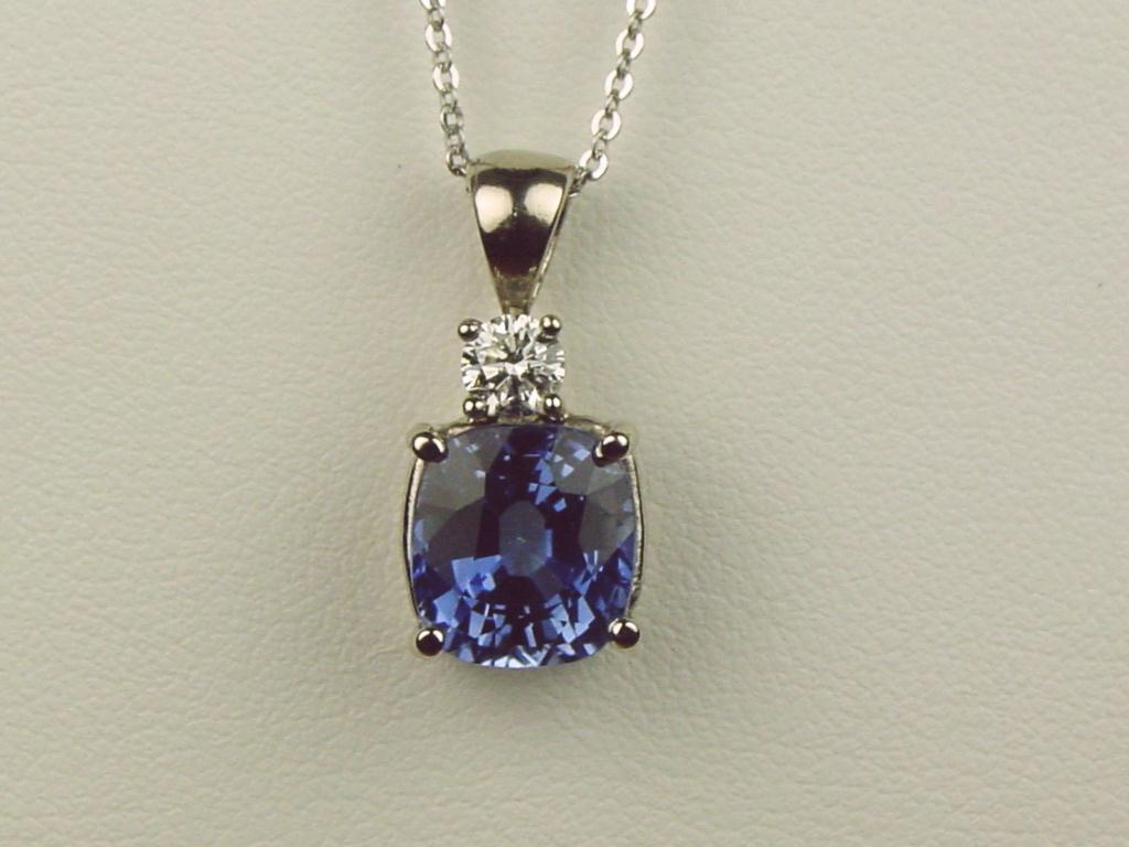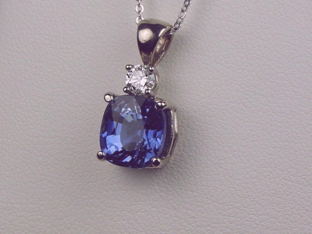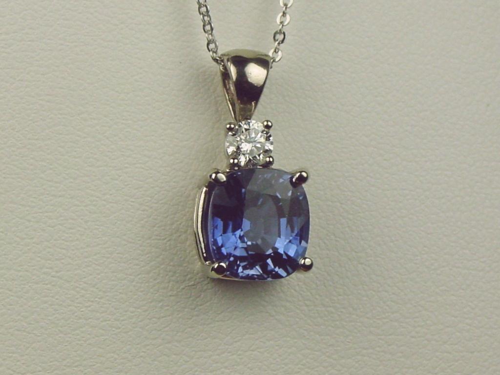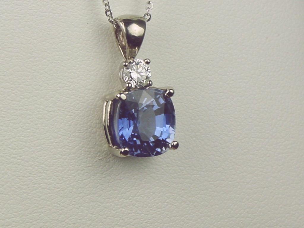 Spectacular 14K WG Ladies Custom Pendant Set with a very fine quality cushion cut ble Sapphire weighing 4.67 carats and side diamond weighing approx 0.25 carats of G-H color and VS/SI clarity. Retail $4,950.00. A Fine item.Set with a very fine quality cushion cut ble Sapphire weighing 4.67 carats and side diamond weighing approx 0.25 carats of G-H color and VS/SI clarity. Retail $4,950.00. A Fine item.