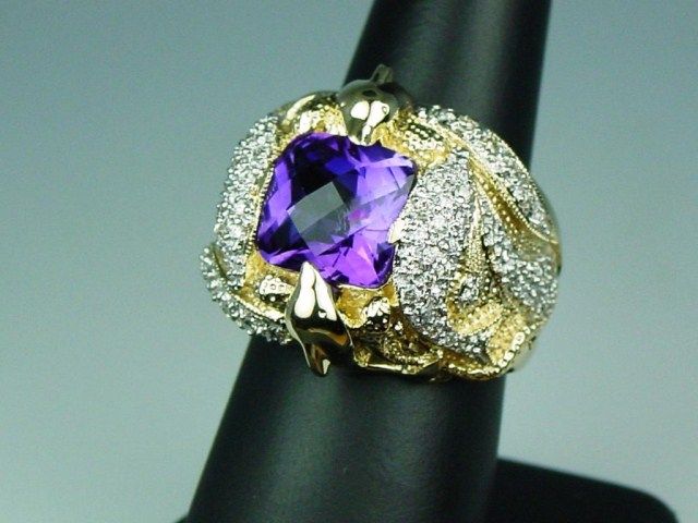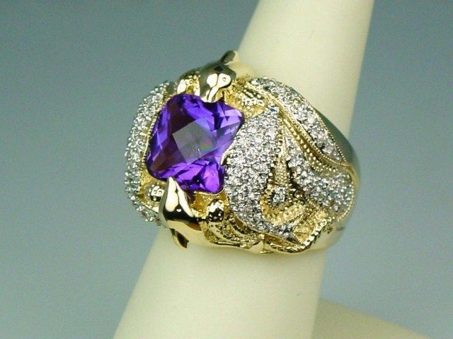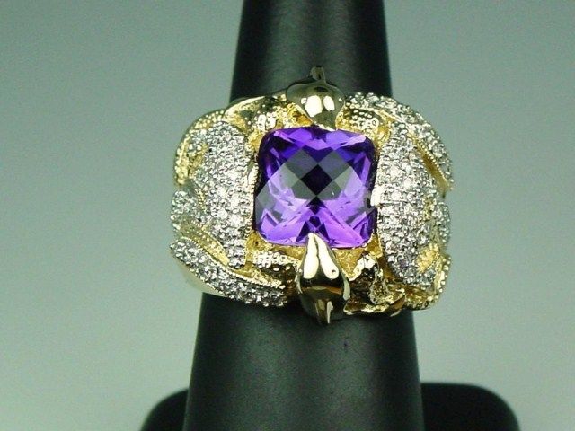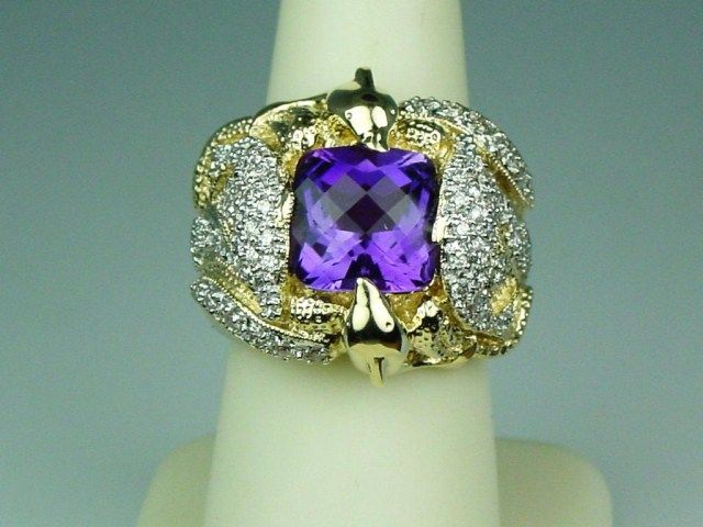 Spectacular “BULGARI” inspired ladies designer ring in 14 karat yellow gold. Set with a checkerboard cut Amethyst weighing approx. 6.00 carats and pave set with over 70 round brilliant cut diamonds weighingapprox. 1.20 carats of G-H colors and mostly VS clarity. Please note the amazing detail of the diamond encrusted Dolphins on this unique setting. Similar designed rings are selling between$6,000-$8,000 in “Bulgari” collections worldwide. Estimate $3,000-$4,000